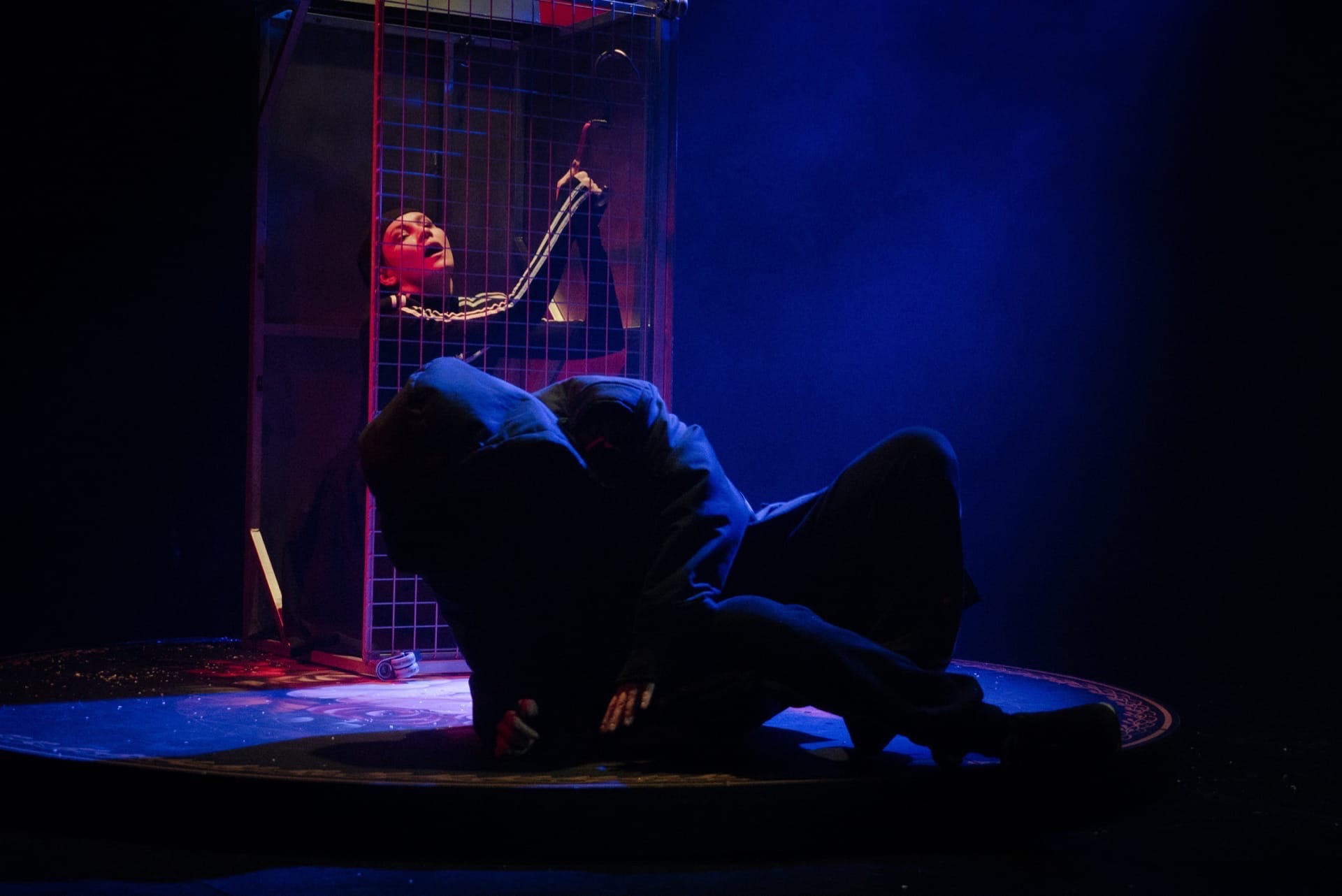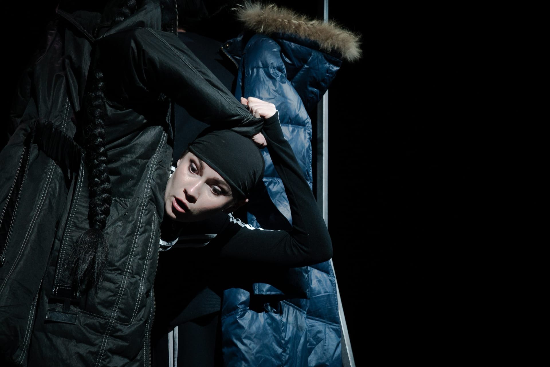 Третий персонаж на сцене — Анау-мынау (согласно программке, “то да сё”), большую часть времени — безликий человек-функция в чёрном, помогающий случаться предметной магии на сцене. Но вот актер Михаил Тараканов снимает маску, оказывается скинхедом-нацистом и, широко и страшно улыбаясь, смертельно ранит Зияш. На примере Зияш и Карлыгаш мы видим разрушительную силу нелюбви и жестокости — в финале освобожденная Карлыгаш не бежит из клетки, а сама ждет в нее новых ласточек.