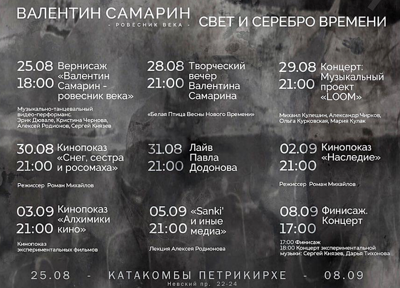 Открытие выставки «Валентин Самарин – ровесник века. Свет и серебро Времени» состоялось 25 августа в Катакомбах Петрикирхе. Выставка открыта с 26 августа — по 8 сентября. Запланирована разнообразная параллельная программа, включающая лекции, кинопоказы и концерт.