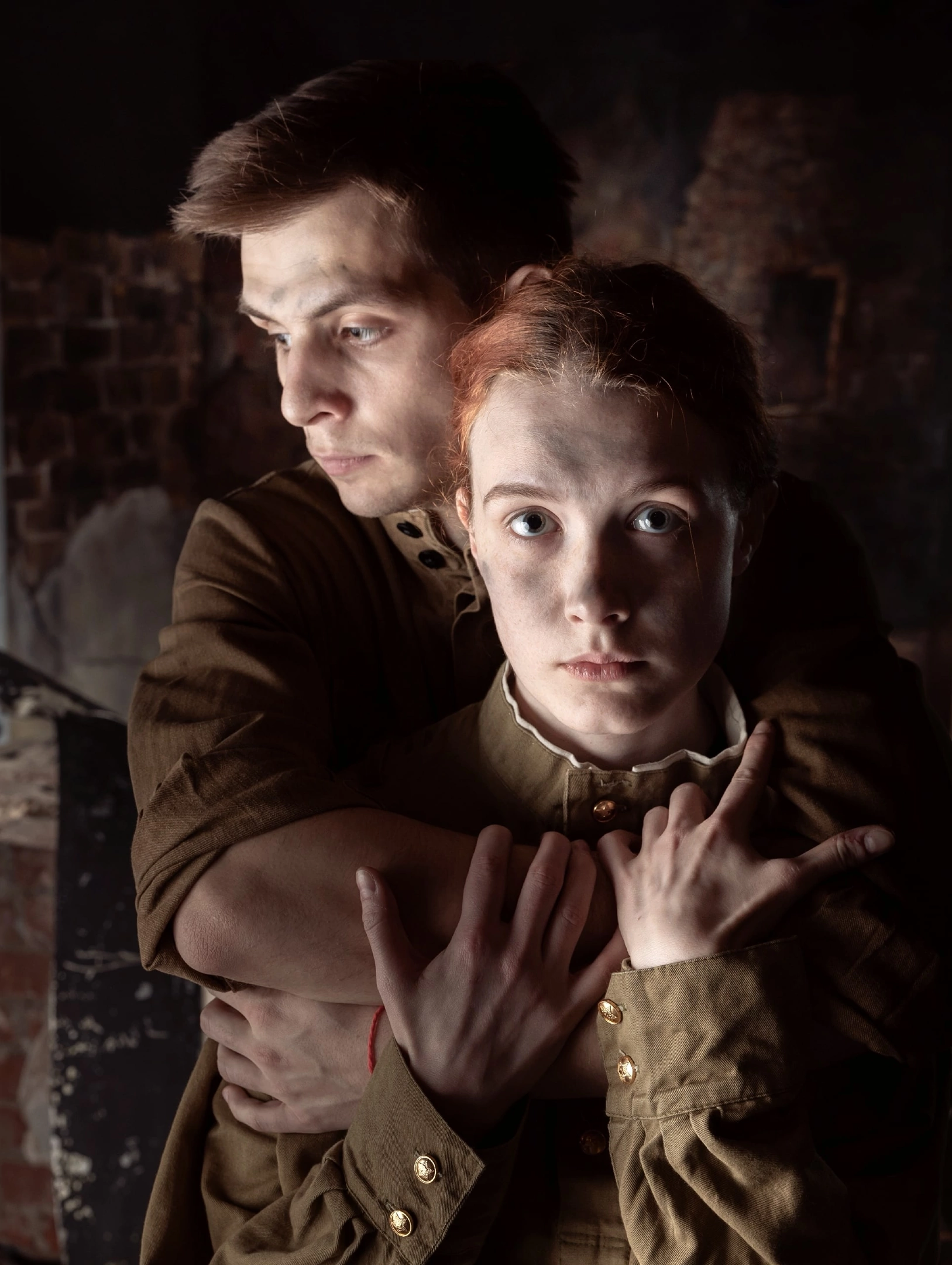 Под потолком мы видим белых бумажных птиц, это аисты. А, может быть, голуби мира или журавли, в которых перерождаются погибшие в бою, как в песне, которую часто исполняют 9 мая? Война в спектакле противопоставлена миру: вот автомат, который несёт смерть, а рядом красивая девушка идёт на танцы в нарядном платье. Автоматная очередь сменяется весёлой музыкой — так и хочется танцевать. А умирать и убивать — нет.