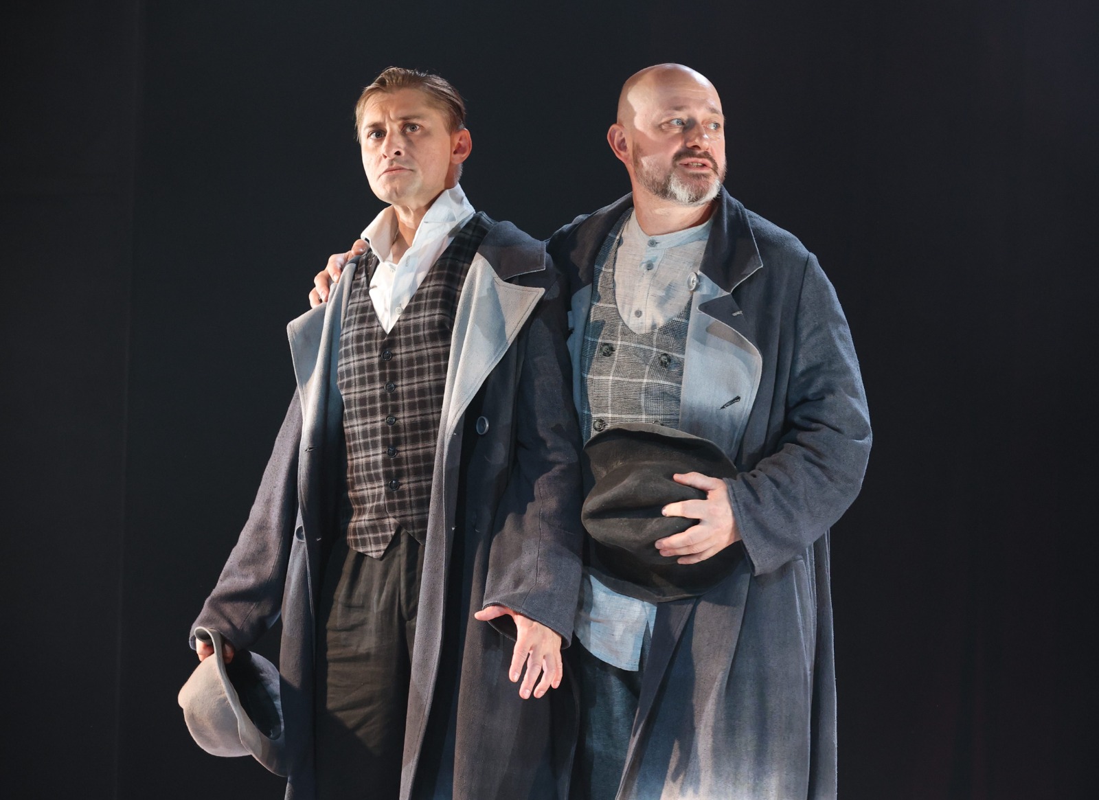 Дверь с хлопком падает, и из неё по очереди выходят герои пьесы. Сначала Аксюша (Ирина Волкова) и Карп (Сергей Жукович), потом Буланов (Данила Лобов). Что не так в этих сценах? То, что герои не выходят за пределы двери. Упавшая дверь с портретом Островского — это их маленькая сцена. За этот “очерченный круг” смог шагнуть только актёр Счастливцев, дальше он берет петлю, надевает себе на шею и произносит горестный монолог в микрофон. К нему навстречу выходит актёр Несчастливцев с ящиком «VEC», и заводит разговор про жизнь трагиков на сцене, при этом он жутко картавит, ему не удаётся произнести звук “р”. Картавый артист, какая ирония, а, может, самоирония театра над театром. Рефлексия на тему театра, как искусства, театральности в жизни и жизни в театре, проходит основной темой через всю постановку. В спектакль введён безмолвный, но при этом тонкий и трепетный персонаж Театральная Моль (Юлия Корж). Она — будто бы хранитель всех театральных заветов, в конце она прячется и заворачивается в бархатный театральный занавес.