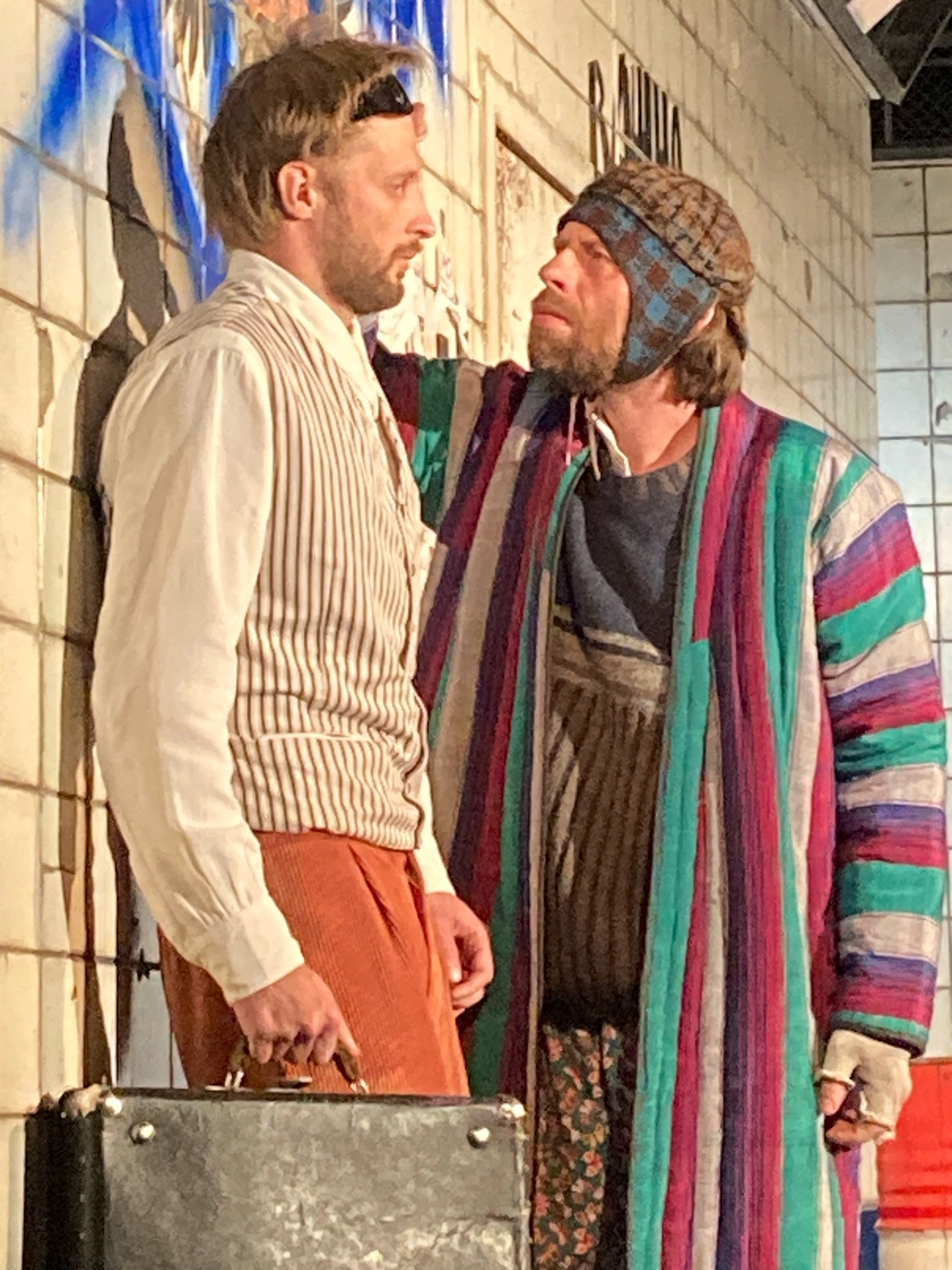 Но страшное будет потом, мы ведь все читали книгу и знаем, чем кончится. Полтора часа мы будем смеяться до слез. Потому что Бендер и Киса будут ходить по зрительному залу в поисках того самого бриллиантового стула и есть канонический доширак в поезде. Потому что отец Фёдор (великолепный Илья Борисов) в своих мечтах, которые никогда не сбудутся, будет врать в письмах жене и отдавать наперсточникам последние штаны, в буквальном смысле. Потому что Татьяна Полонская — действительно знойная женщина, мечта поэта и похожа на пирата. Потому что Владимир Карпов будет то подавать водку и закуску в кафе-шалман, под современную попсу, то изображать инвалида, чтобы заработать денег, на которые потом купят стулья, только они никому не принесут счастья. Марина Даминева играет то уличного мальчишку, то жену, не желающую ходить в вегетарианскую столовую. Россия, которая нас не забудет, предстаёт в виде большой коммунальной квартиры, в которой самые разные люди вынуждены уживаться вместе: в одной комнате любят друг друга, в другой — ругаются, «на тридцать восемь комнаток всего одна уборная», и она постоянно занята.