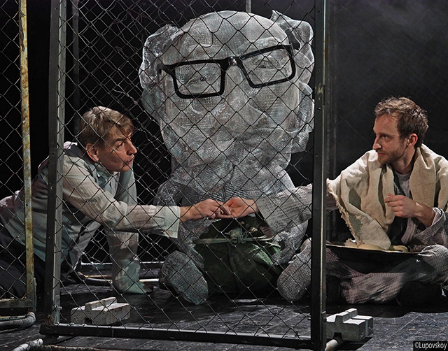 Спектакль ещё не начался, и взгляд невольно упирается в сетки железных кроватей, которые поставлены вертикально на сцене. Может, и не кровати вовсе, а клетки для зверей, ограждения, вариантов в голове рождается множество. Всматриваешься вглубь — видишь сначала стопку из трёх матрасов и гору тряпья на них, потом удаётся рассмотреть часть лица. Справа на авансцене что-то похожее на небольшой кабинет: стул, книжные полки и огромный бюст философа. Слева на авансцене тоже кабинет: в нем только стол и стул на колёсиках. На переднем плане ведро, швабра и металлический чайник. Собирается такой аскетичный натюрморт, вызывающий много интерпретаций, располагающий к размышлениям.