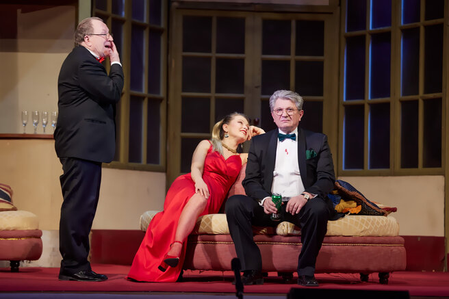 Автор постановки – Нил Саймон, режиссер – Вадим Дубровицкий. Для зрителей выступят: народные артисты России Владимир Стеклов, Валентин Смирнитский, Андрей Ильин, Ольга Волкова, заслуженные артисты России Игорь Ливанов, Елена Сафонова, России Владимир Богданов, артисты Эльвира Болгова и Инна Милорадова, а также такса по кличке Тоша.
