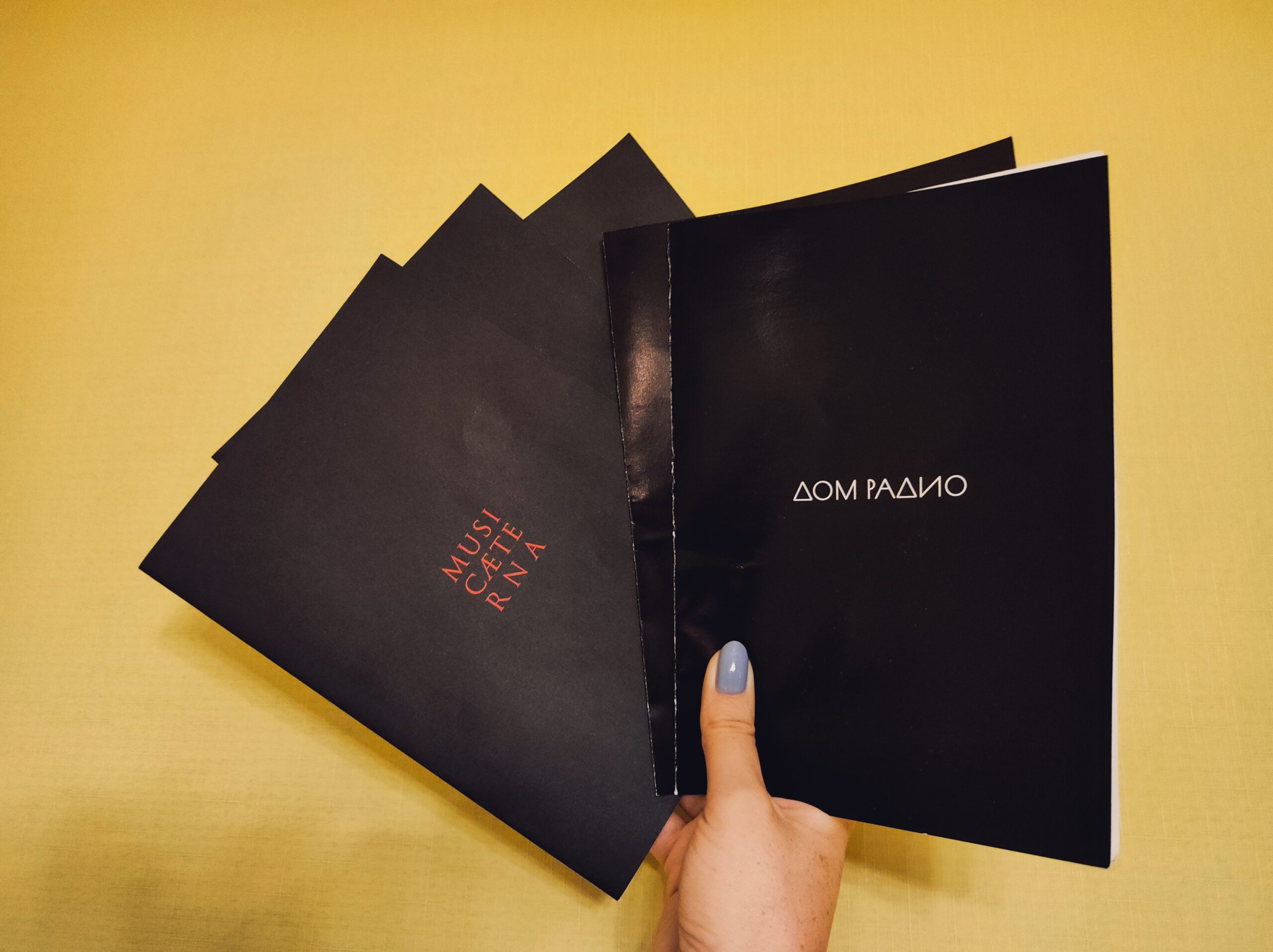 Дом Радио – уже давно (и даже с самого начала) не просто репетиционная база оркестра, хора, а с прошлого года – и танцевальной труппы – musicAeterna, а полноценная культурная институция, самая динамично развивающаяся в городе, постоянно прирастающая новыми глубинами и измерениями. Если бы передо мной стояла задача создать визуальную схему направлений работы и событий Дома Радио и musicAeterna – это была бы анимация с непрерывно перетекающими друг в друга объемами и линиями и внезапными вспышками. Хорошая идея для видеоарта, но разобраться непросто: верный признак пышущего жизнью организма. С этого сезона, кстати, для публики стало проявленным внутреннее административное деление на коллектив musicAeterna и площадку Дом Радио: теперь аудитории стоит следить за двумя каналами [https://t.me/musicaeternaTC и https://t.me/domradio_online] вместо одного, чтобы вовремя поймать ссылку на регистрацию (на наш круглый стол, к слову, регистрация закрылась за 30 секунд, но за день до события появились дополнительные места), а матовые программки с красными буквами сменились глянцевыми с белым текстом.