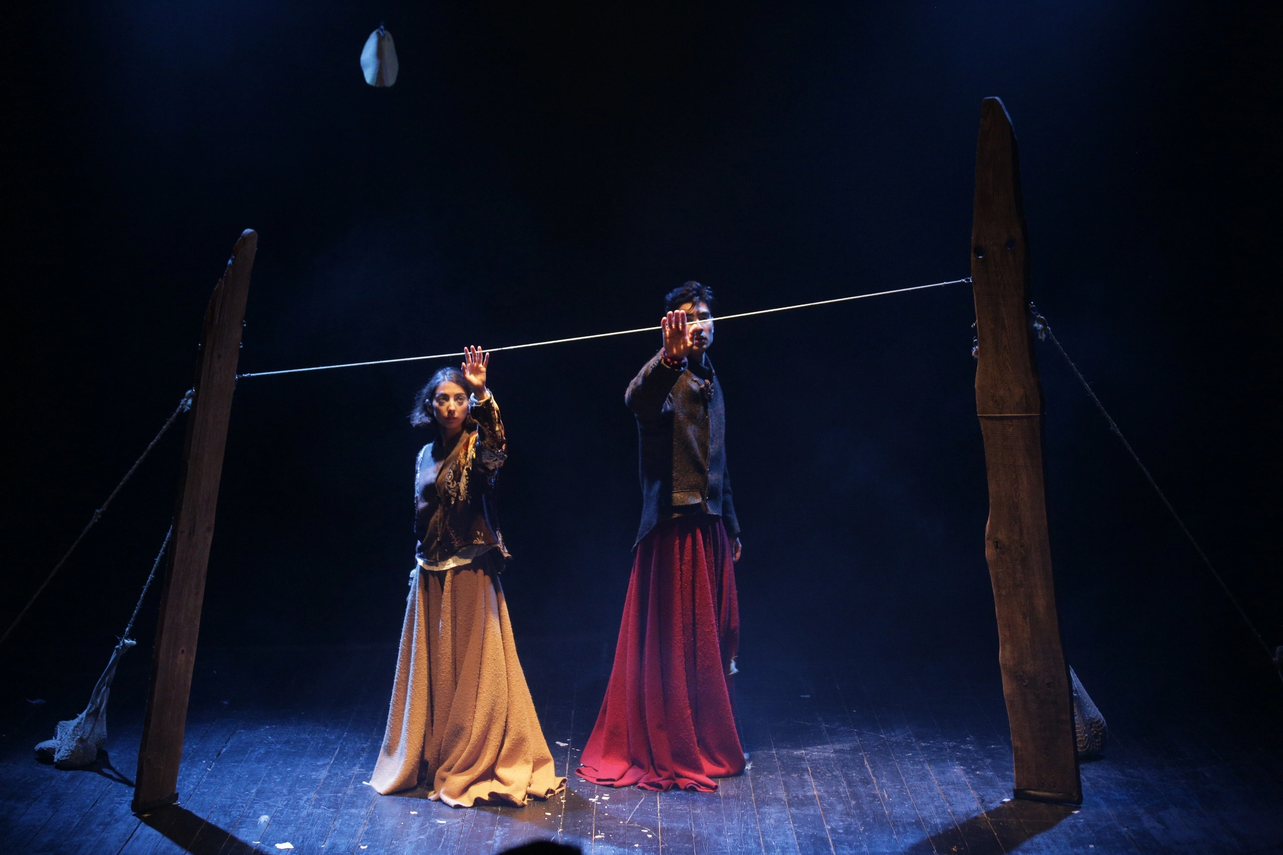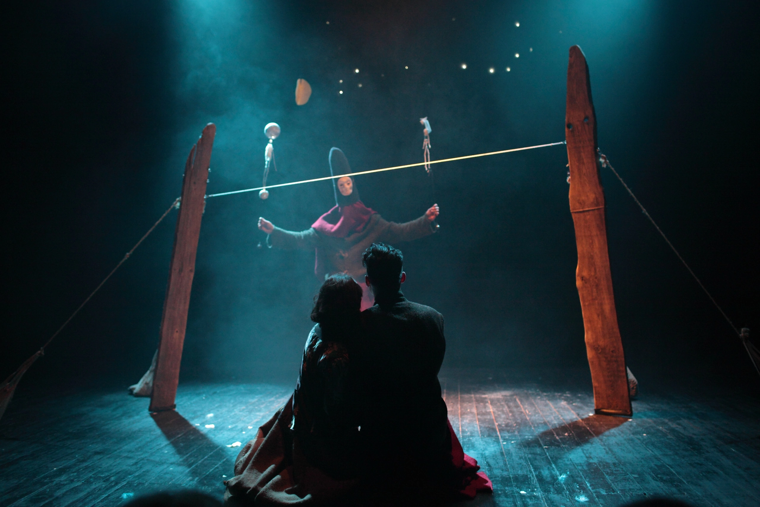 Затемнённое пространство, горловое пение, люди в национальных нарядах. Медитативно, медленно, спектакль вовлекает своего зрителя в легенду деревни канатоходцев. Когда заходишь в зал, совершая несмелые шаги в полутьме, кажется, будто бы двое мужчин, находящиеся на сцене, вовсе не актёры, исполняющие свои роли, а люди, пришедшие издалека, чтобы рассказать историю, которую им передали их предки. Это «Деревня канатоходцев» Яны Туминой в театре «Открытое Пространство», премьера состоялась в 2017.