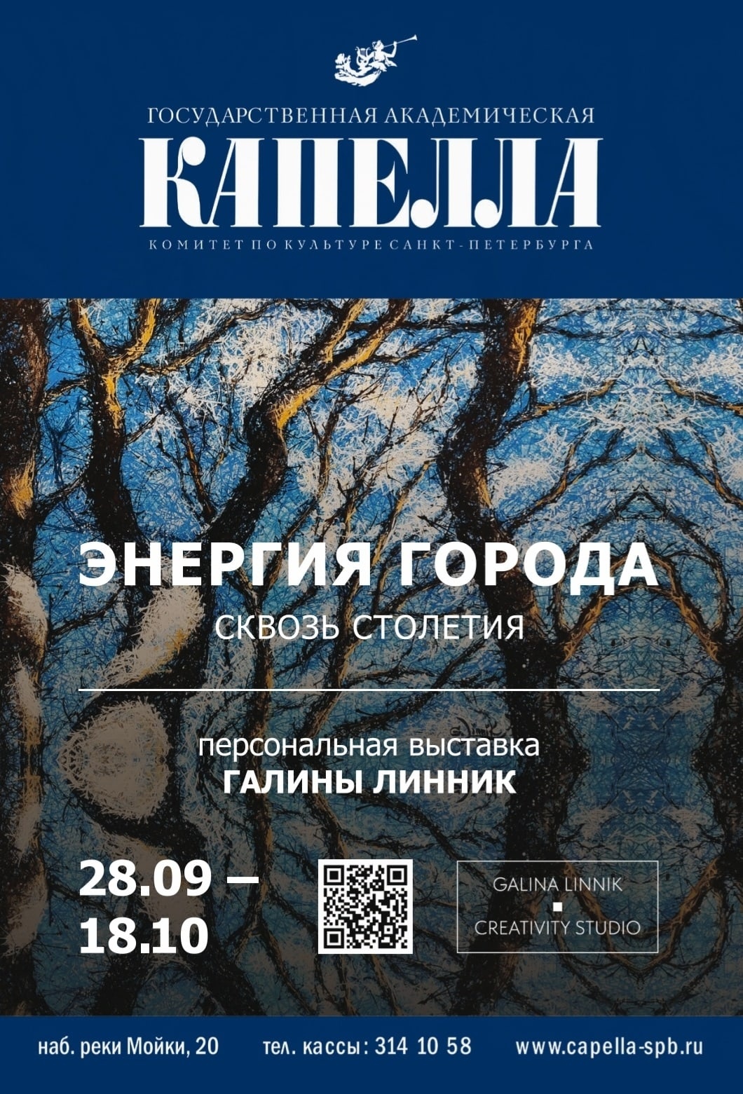 С 28 сентября по 18 октября в Белом зале Капеллы пройдет персональная художественная выставка Галины Линник «Энергия города – сквозь столетия». У каждого города свой характер, своя история и свое предназначение. В нем присутствует особенная внутренняя энергия и пульсация жизни. Звучание города сквозь столетия состоит из множества деталей и пережитых событий, которые передаются через поколения и образуют неразрывные прочные связи. Люди, деревья, дома являются энергетическими узлами, формирующими контур времени со своими историческими маршрутами. Импульсы многогранного Петербурга вдохновляют творцов на новые шедевры.