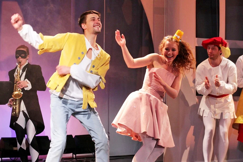 Я никогда не обращаю внимания на костюмы, но здесь они слишком милые (художник София Матвеева): у собачки мягкий, будто плюшевый костюм с пятнышком на попе, а коту к лицу жабо. У придворных красные береты, они в этом сезоне вроде опять вошли в моду. У Короля большая корона, у Принцессы — миниатюрная, их наряды украшены бантиками. В спектакле не будет погони и выслеживания, только свадьба и «жили они долго и счастливо», потому что ничто не способно разлучить влюбленных. Иногда (кажется, очень редко) всё заканчивается хорошо и никогда больше не придётся расстаться. Это любовь приближает счастливый финал.