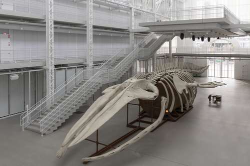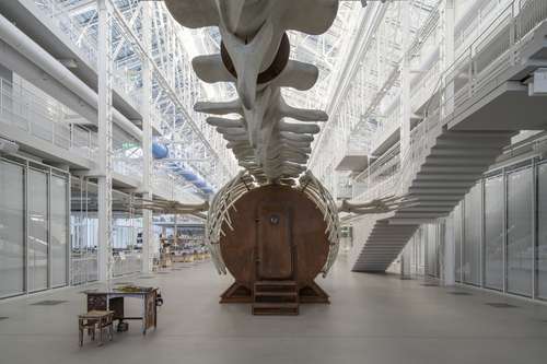 Посредине белоснежного Проспекта «ГЭС-2» в начале сентября появился внушительных размеров скелет. Напоминает эта конструкция кадры из фильмов «Ночь в музее» и «Парк юрского периода». Проще говоря – скелет какого-то динозавра. Если подойти ближе, становится понятно, что скелет скорее рыбы, – например, кита. А на месте внутренностей –чугунная капсула вроде подводной лодки, забытой на дне океана и изъеденной ржавчиной.