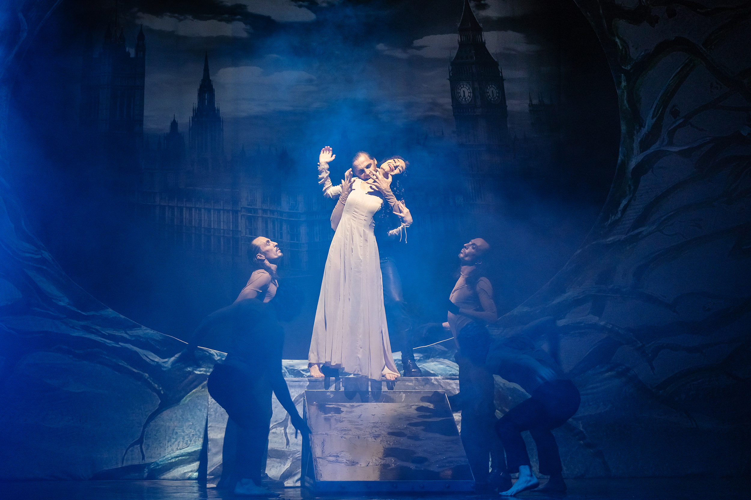 Все вышеуказанное помогало отвлечь внимание от декораций, которые довольно минималистичны. На заднике – стена с проемом для видеопроекции, отображающей место действия (Лондон и Трансильвания). Посередине сцены – помост, на который периодически всходят герои. Из передвигающихся частей декораций – двигающиеся конусообразные конструкции, выступающие и клетками, и стенами, и растительностью. Основная работа легла на плечи занавеса, на котором транслировались перемещения, текст и др. Однако, ввиду насыщенности действия, скромность декораций не напрягает и не мешает пониманию событий.