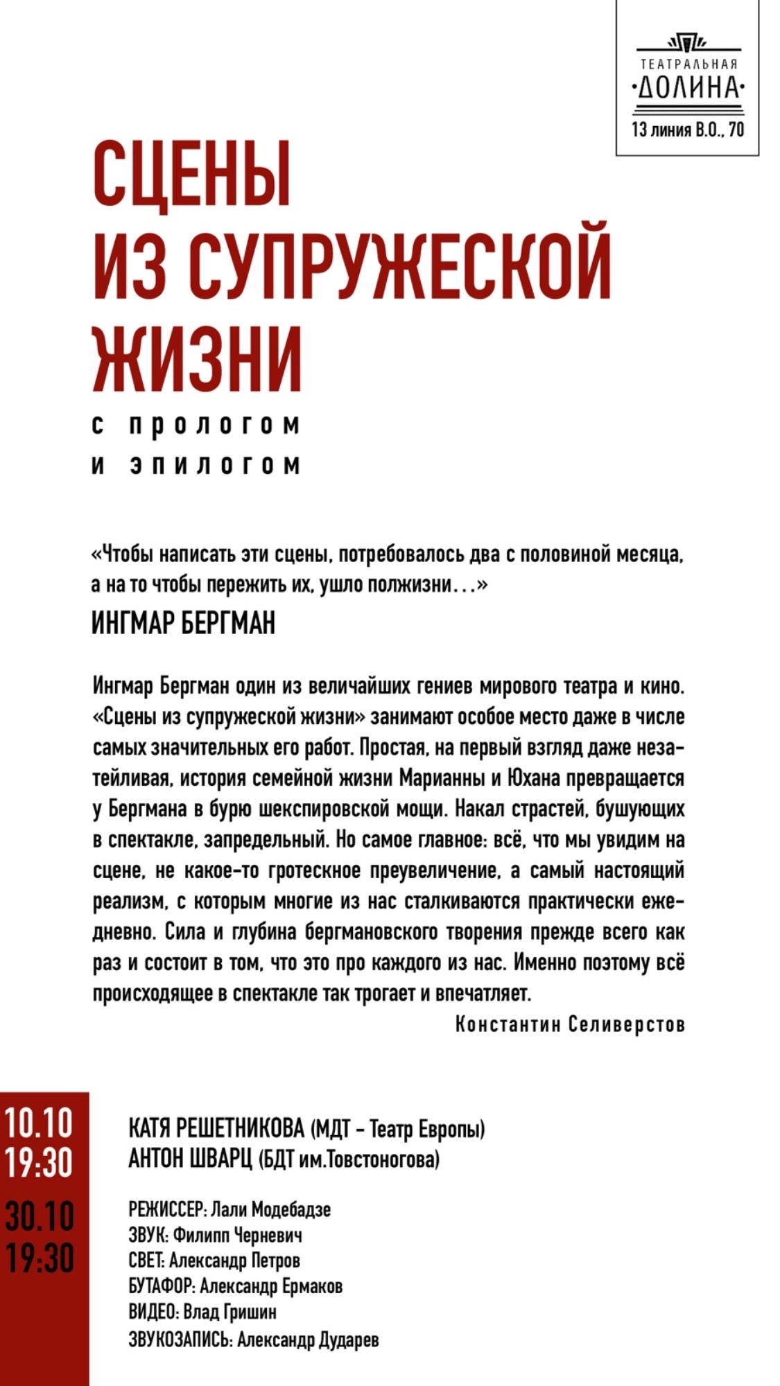 Новое прочтение «Сцен из супружеской жизни» великого Ингмара Бергмана предлагает одноименный спектакль, премьера которого состоится уже 10 октября в «Театральной долине»! В постановке заняты Катя Решетникова (МДТ — Театр Европы) и Антон Шварц (БДТ им.Товстоногова).