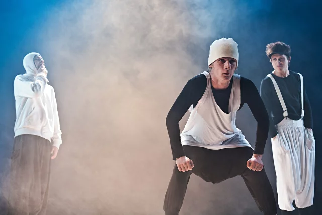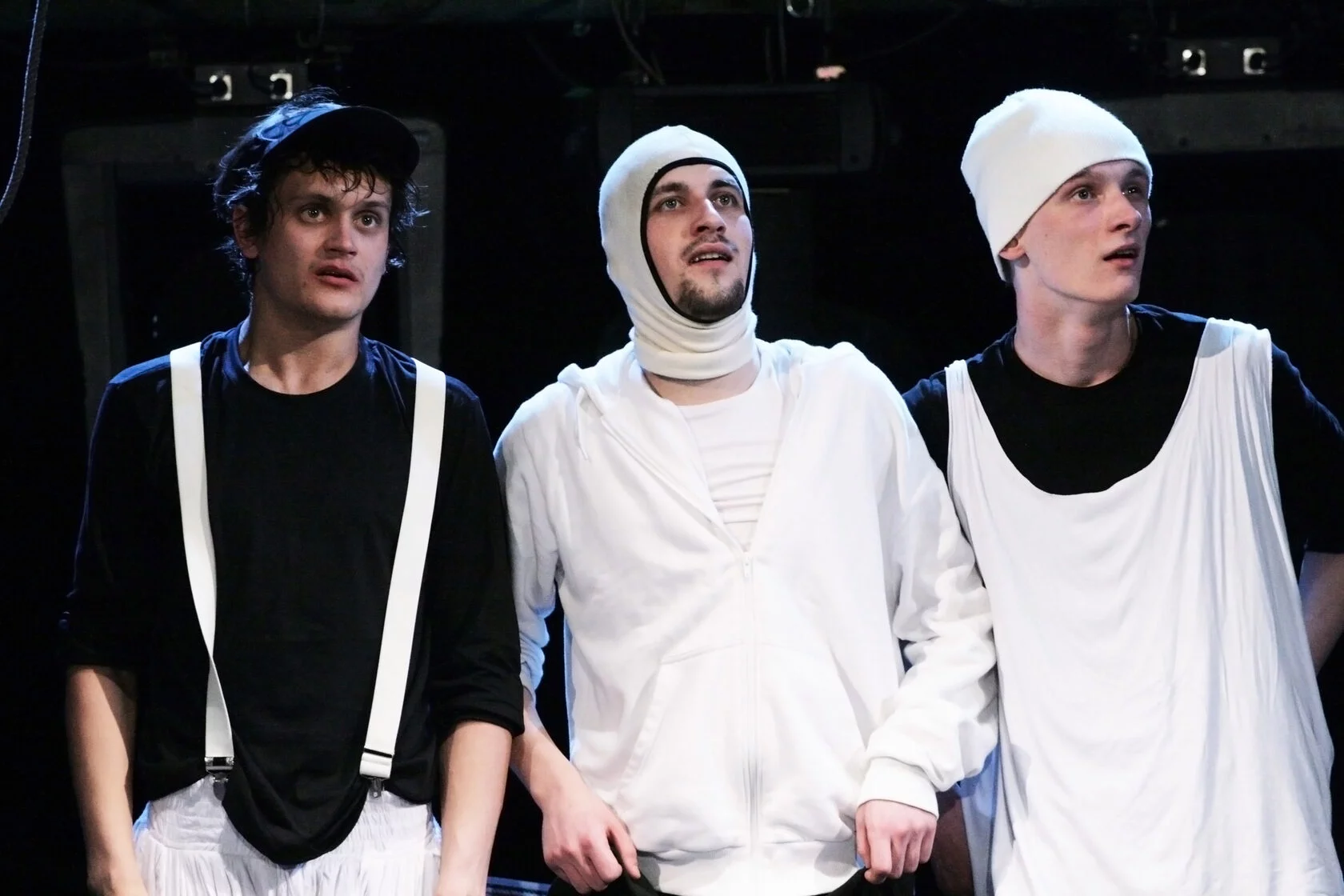 Пока я ждала, когда спектакль Екатерины Гороховской «У ковчега в восемь» (премьера — 2010 год) прорвётся в моё расписание, то успела сходить на эту же пьесу в театр-студию «Курт», где пингвинов без имён, Первого, Второго и Третьего, которые могут ссориться, да, но никогда не оставят друг друга, играют юные девушки. Ну а в «Мастерской» пингвины — трое мужчин под сорок (могу себе позволить так сказать, потому что мне самой под сорок): Евгений Шумейко, Николай Куглянт и Михаил Касапов. Трое потрясающих актёров, которые, играя тринадцать лет, всё так же кайфуют от происходящего.