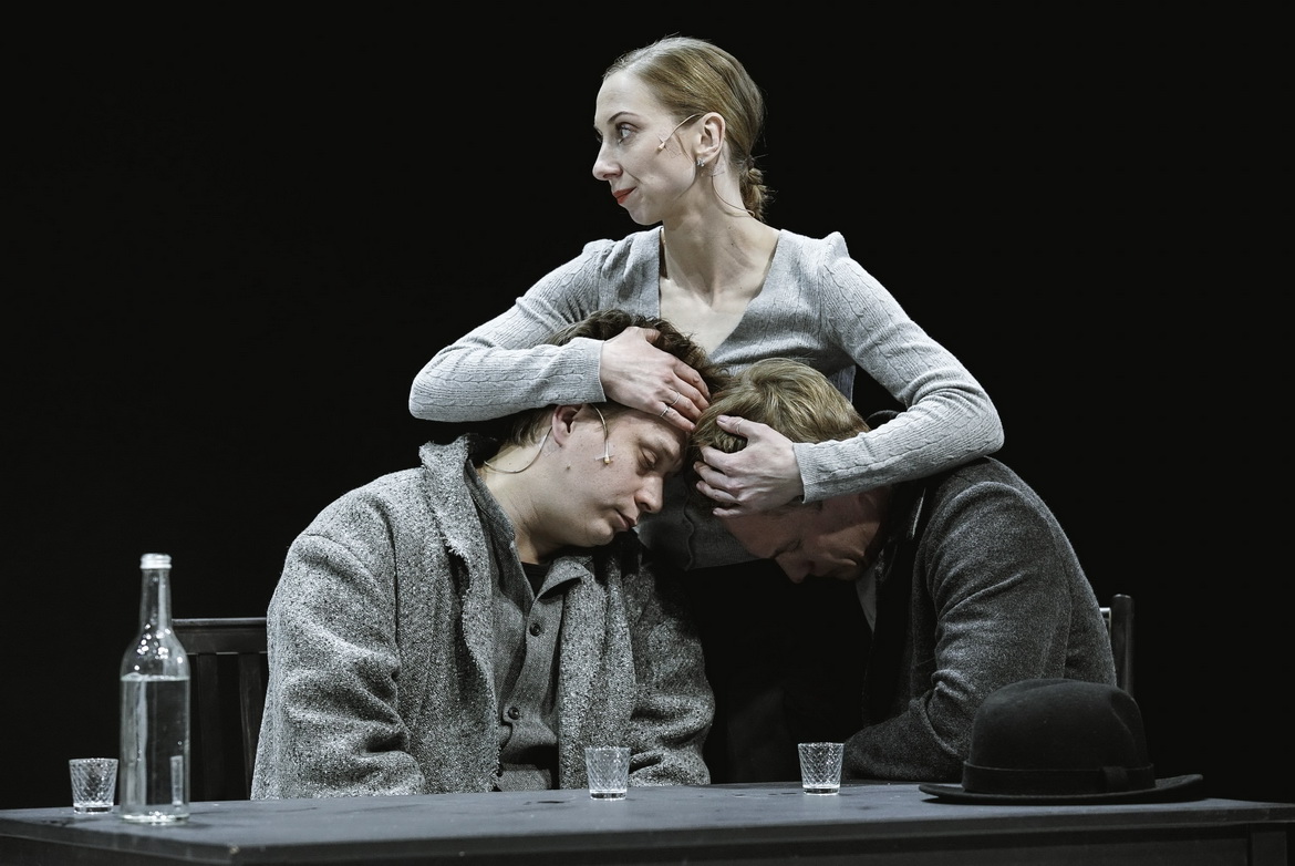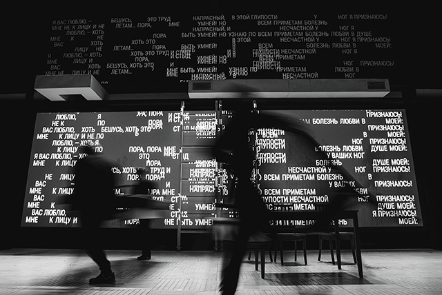 Сценическое пространство, созданное Михаилом Краменко, на первый взгляд кажется стерильным, математически рассчитанным, это почти “скандинавский стиль”, знакомый по страницам глянцевых журналов и постов в социальных сетях. Ничего лишнего — функциональность и чёрно-белая гамма. Стена выполняет функцию огромной школьной доски, которую будут заполнять слова. Одна сторона белая — стена комнаты, наша жизнь напоказ, вторая же сторона чёрная — это наше внутреннее. По бокам сцены расставлены бюсты классиков, их лица непроницаемы, как на портретах, висящих в школе. Они смотрят на то, что творится, но ни написать, ни сказать уже ничего не могут. В какой-то момент появляются движущиеся шведские стенки, как одновременно отсылка к школе и возможность для героев забраться на недосягаемую высоту, или замереть в позе Христа на распятии. Еще на ней можно болтать ногами и читать Чехова, качать пресс под декламирование стихов. Сценическое решение до самого конца не терпит никаких цветовых пятен, принесённый Павлушей (Николай Белин) букет “жёлтых лютиков” простоит на столе недолго и будет безжалостно выкинут. Только в финале появится чуть больше цвета, но и это будут приглушённые цвета, чтобы не нарушать гармонии и кинематографичности пространства.