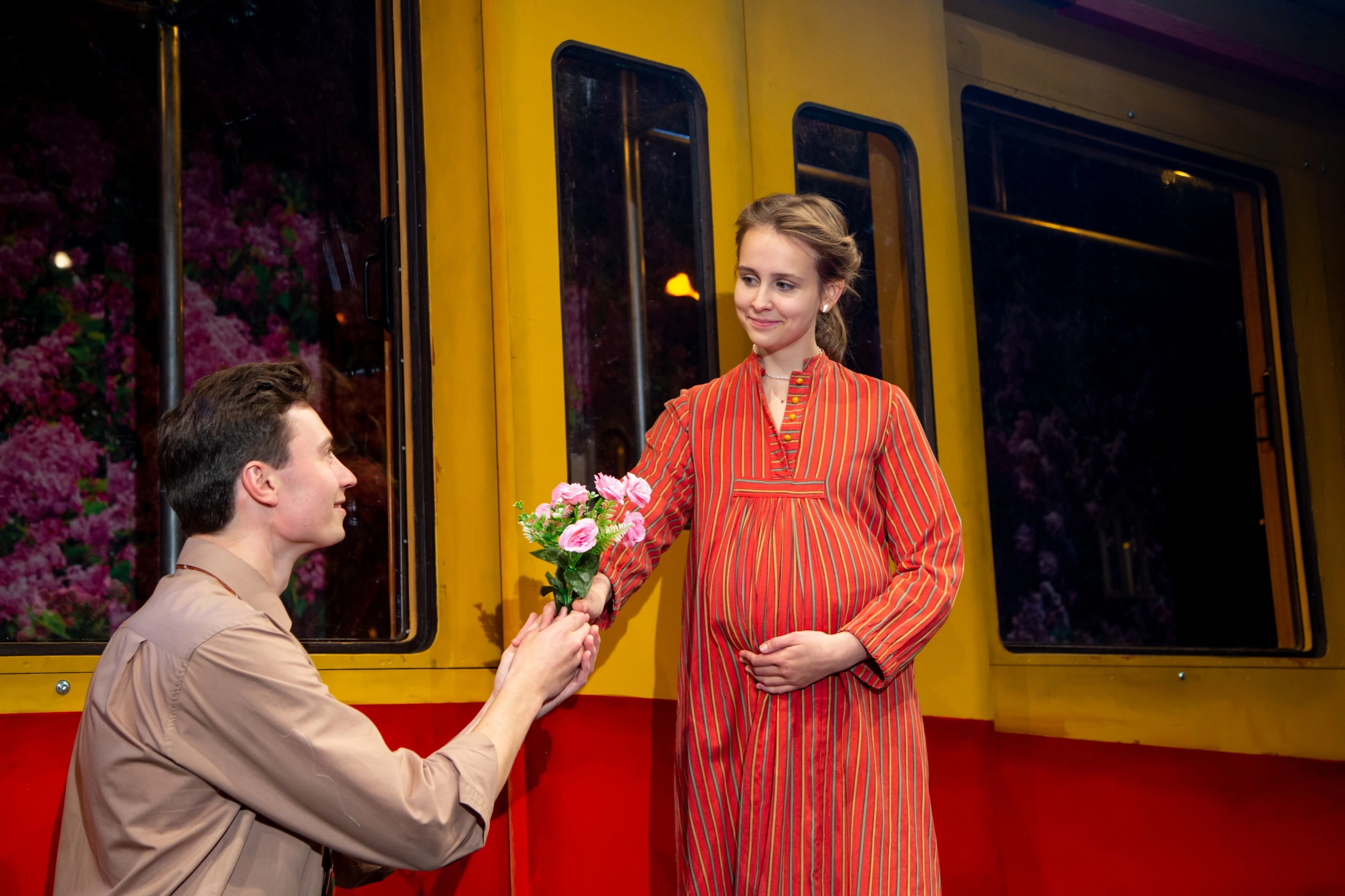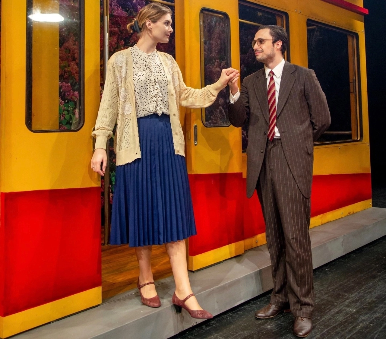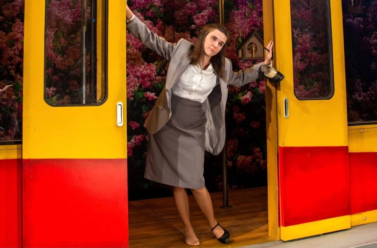 Кроме летки-енки паузы между сценами заполняет проезжающий из одного конца сцены в другой трамвай. Этот ход выводит героев в совсем иной масштаб: движение преобразует пространство, добавляет ему кинематографичность, открывает выход за пределы театрального зала на улицу. Трамвай привозит молодоженов на сцену и увозит понравившуюся девушку вдаль.