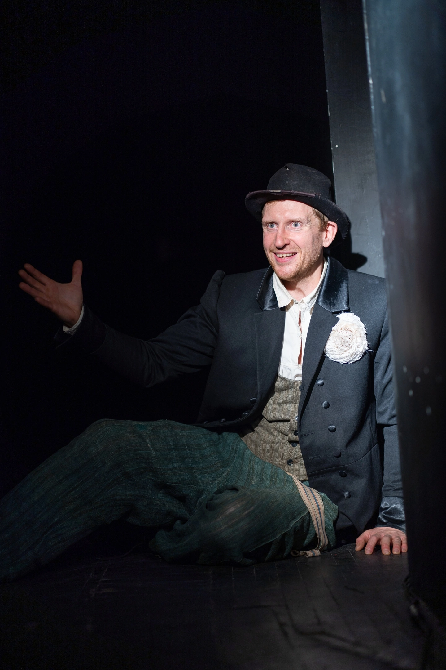 Да. Для этого персонажа важен голос, я его долго искал. Изначально я так говорил весь спектакль. Зрители сидели и думали, то ли на сцене идиоты, то ли это к ним относятся, как к идиотам. Наши знакомые признались, что тоже не понимали, что происходит. Режиссёрски мы с Денисом всё простроили, мы всё-таки что-то понимаем в этой профессии. Но, видимо, как актер я не очень хорошо это делаю. На показе, где ты была, я уже поменьше использовал этот голос. Мы думаем вообще убрать этот прием или оставить только в диалогах. Дело в том, что Гимпл — не умственно отсталый, не чудик, не юродивый. Он полноценный здоровый чувак, умеет зарабатывать деньги. Но всё же есть в нём что-то, из-за чего все его разыгрывают и позволяют себе неуважительно относиться. И Гимпл тоже это чувствует. Возможно, поэтому и прощает все издевки. Потому что слишком хорошо все понимает. Чтобы это передать, нам надо было придумать какой-то физический изъян, но который вызывает не сострадание, а смех.
