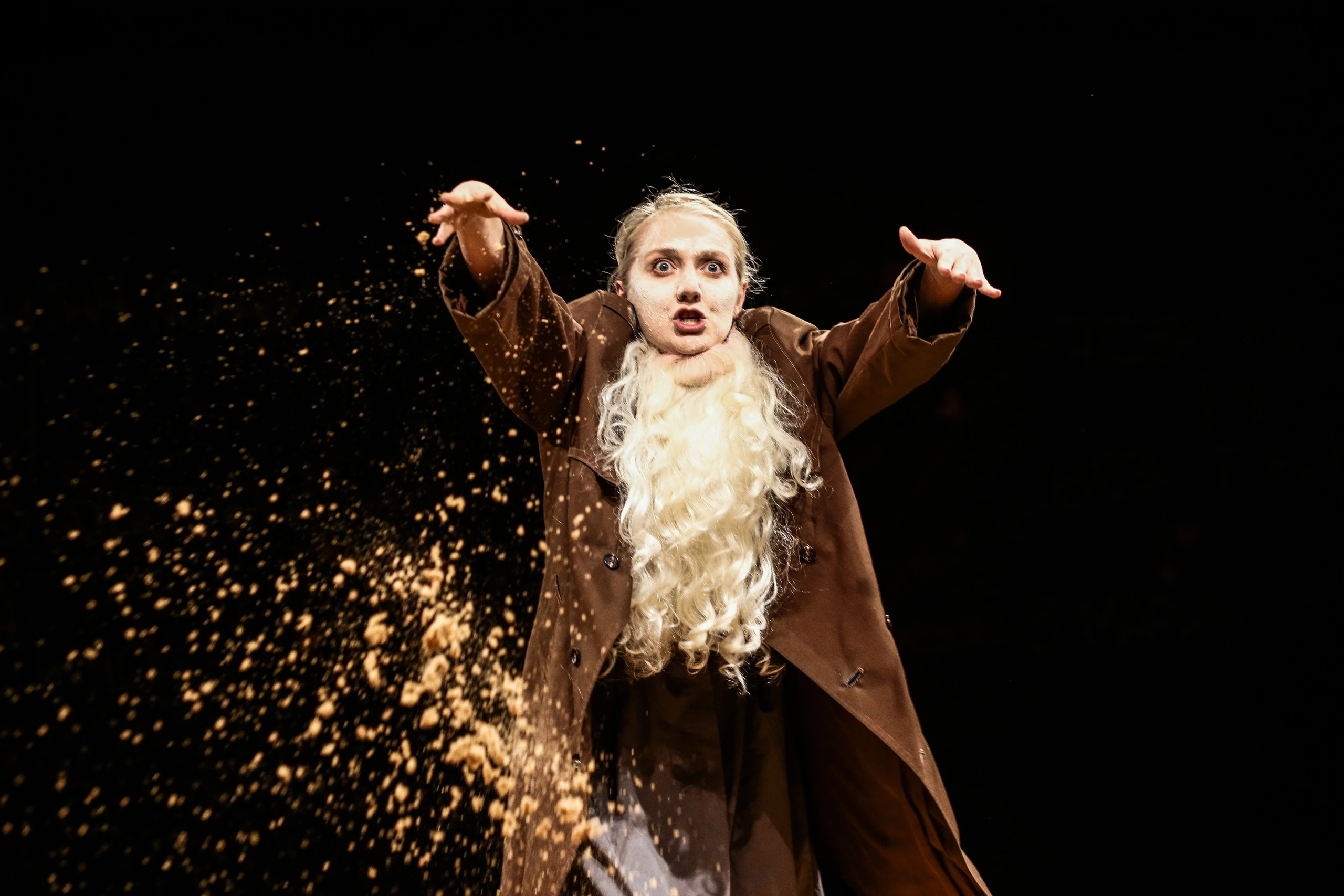 С самого начала зрителей плавно подводят к спектаклю: места в зале занимаем под веселую незатейливую мелодию, которая льется со сцены и слегка напоминает средневековую. Без знания истории это выглядит примерно так: актеры почти в рабочей одежде сидят перед зрителями и играют на маленьких копиях музыкальных инструментов (как выяснится позже — мелодика, укулеле, маленькие барабаны и что-то еще). «А где Шекспир?» — слышу в диалоге сидящих рядом парней. И вдруг раздается третий звонок и начинается магия…