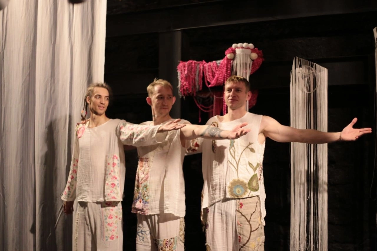 Суперкамерней почти некуда. Мигает свет и выходят три босых Существа – если бы я не прочитала потом на сайте театра их идентификацию, то я бы вряд ли соотнесла их со скоморохами (Олег Горсков, Александр Спицын и Александр Шалыгин). И начинается обряд, шаманство, волшебство. Пристально посмотрев в глаза всем пришедшим на спектакль, скоморохи в белых льняных свободных одеждах с вышивками заводят стих-песнь, переливающийся из одной истории в другую… То надевая какие-то шикарные многосоставные головные уборы, напоминающие кокошник и скрывающие часть лица, то вязаные языческие маски-балаклавы, закрывающие лицо полностью, они как бы говорят «мы всего лишь маски и ведем историю от их лиц». Сказка Пушкина «Жених» («Три дня купеческая дочь…») про страшный и вещий сон юной девушки Наташи, результатом которого стала казнь ее жениха; русские народные сказки, знакомые широкой публике по сборнику собирателя русского фольклора Александра Афанасьева, – например, про Правду и Кривду, где Правде вырывают глаза (но сила, как мы знаем, все равно остается за ней), или сказка «Серебряное блюдечко и наливное яблочко» о том, как две старшие сестры убили и закопали младшую, или сказка «Василиса Прекрасная» о том, как девушка жила в гостях у Яги; или сказание о вещунье, где девушка поменялась местами с «небесной сестрой» и осталась жить на небе, а та отправилась на землю; сказка Надежды Тэффи «Баба Яга» о старой ведьме, до смерти запутавшей-закружившей в снежном вихре едущего к своей любимой молодца. «Баба-Яга! Старая, страшная! Людоедка проклятая! Ах, какая же ты чудесная, певучая, хрустальноокая! БО-ГИ-НЯ. Бери меня в твою смерть — она лучше жизни» – ну, какой же пленительный слог! Так же пленительно и певуче раскладывали на троих реплики исполнители всех ролей – один начинал историю, второй подхватывал, третий завершал. И так по кругу под замирающий или пускающийся в разноцветных пляс свет.