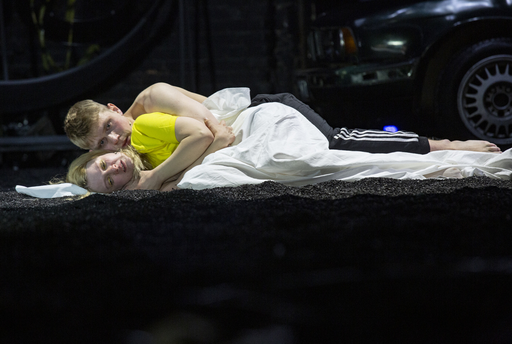 Художник Анвар Гумаров подвешивает над сценой куб (но не метафизический куб подсознания, как в “Идиоте” в Приюте Комедианта, а белоснежный), который порой опускается, а на одной из его граней транслируется происходящее на сцене (излюбленный приём режиссера-онлайн-театр). Периодически появляется стена из кроссовок, и сразу ассоциации то ли с венгерским мемориалом геноцид, толи с традицией бандитских трофеев. Еще одна примета лихих 90-х на сцене — старенький мерседес, а всё пространство покрыто то ли пеплом, то ли землей. Этот огород, заботливо возделываемый матерью Джульетты (Екатерина Александрушкина), вскоре превратится в холмики могил, а на пищу червям, что перебирал добродушный Бенволио (Андрей Максимов), пойдёт первая жертва войны кланов — Меркуцио (Максим Виноградов).
