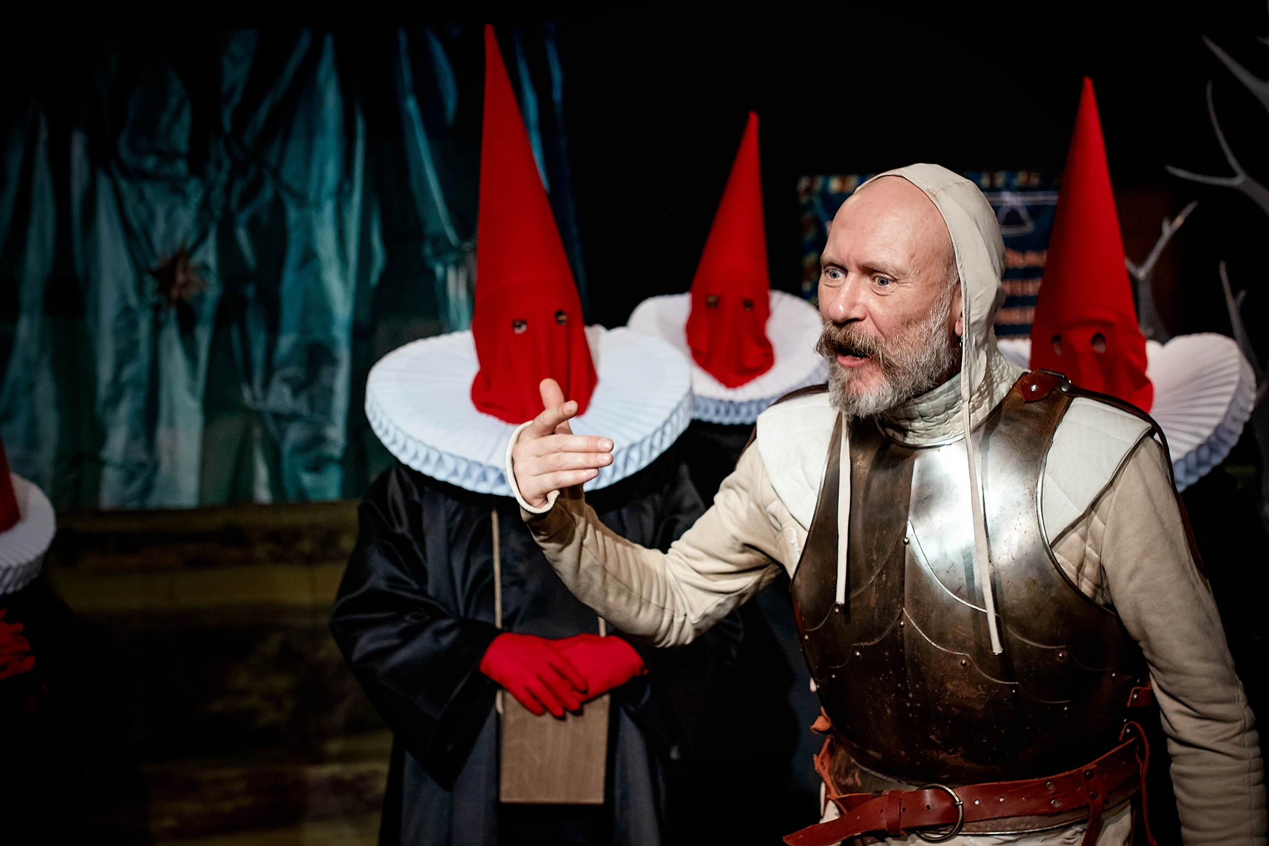 По задумке режиссера зрители попадают в параллельную вселенную, внешне очень похожую на детскую книжку с яркими иллюстрациями и выдвижными картинками. На фоне зеленых полей двигаются овечки и осел, а Дон Кихот и Санчо решают экзистенциальные вопросы в девяти главах. Рассказчиком истории или своеобразным «мастером» этого воображаемого мира выступает глашатай, которого сыграл Иван Байкалов. Ему удалось воплотить многогранный образ. Глашатай – бог и дьявол этого мира, способный поставить время на паузу или закончить любую историю по своей воле. Он же – менестрель, лектор, искусствовед, критик, философ, стендап-комик, умеющий не только текстом, но и живой мимикой, изменениями тембра, горящим взглядом заставлять себя слушать. Зрители волей-неволей начинают отвечать, комментировать, подпевать, смеяться, задумываться в тех местах, где глашатай своей длинной указкой, словно дирижер, показывает им, что это нужно делать.