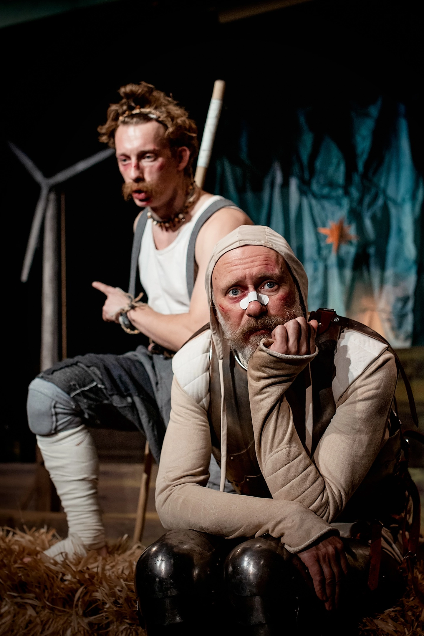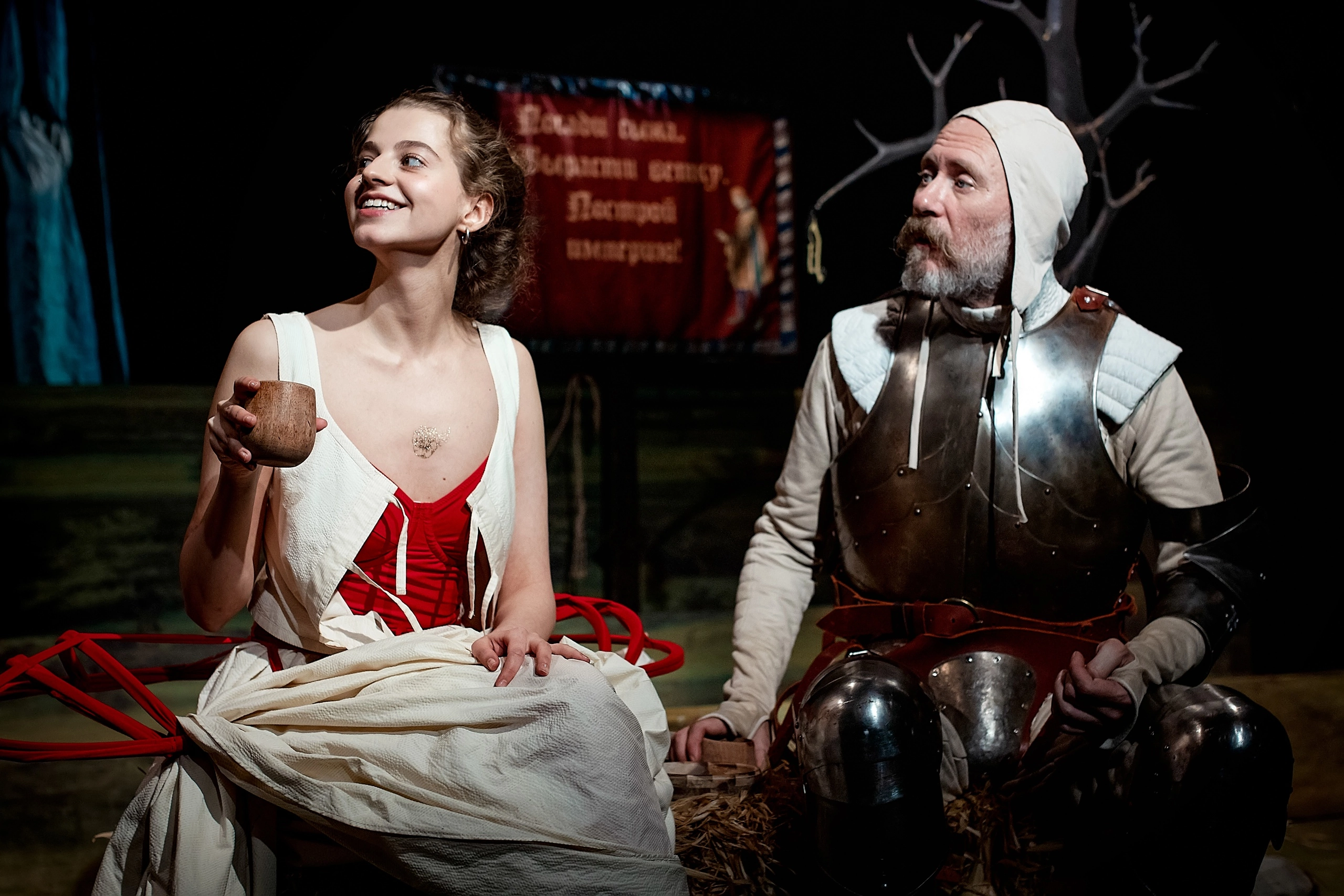 «Дон Кихот» в Субботе — это послесловие или сиквел к и без того довольно пародийному сюжету Сервантеса. Только в пьесе Настасьи Федоровой смеяться можно уже не только над рыцарскими идеалами и новеллами, а над тем, что актуально сегодня. Например, над тем, как инквизиторы, словно опытные коучи со сцены, продают индульгенции или над меняющимися слоганами на билборде, вроде «Посади сына, вырасти ветку, построй империю». Анималистические аллегории создают ощущения абсурдности происходящего: блеющая овца, как образ бога, и шокирует, и провоцирует, но, все-таки, самым пронзительным моментом можно считать философский диалог с анекдотами осла и лошади. Это юмор нового порядка: «пелевинского», постмодернистского и одновременно бытового, простонародного.