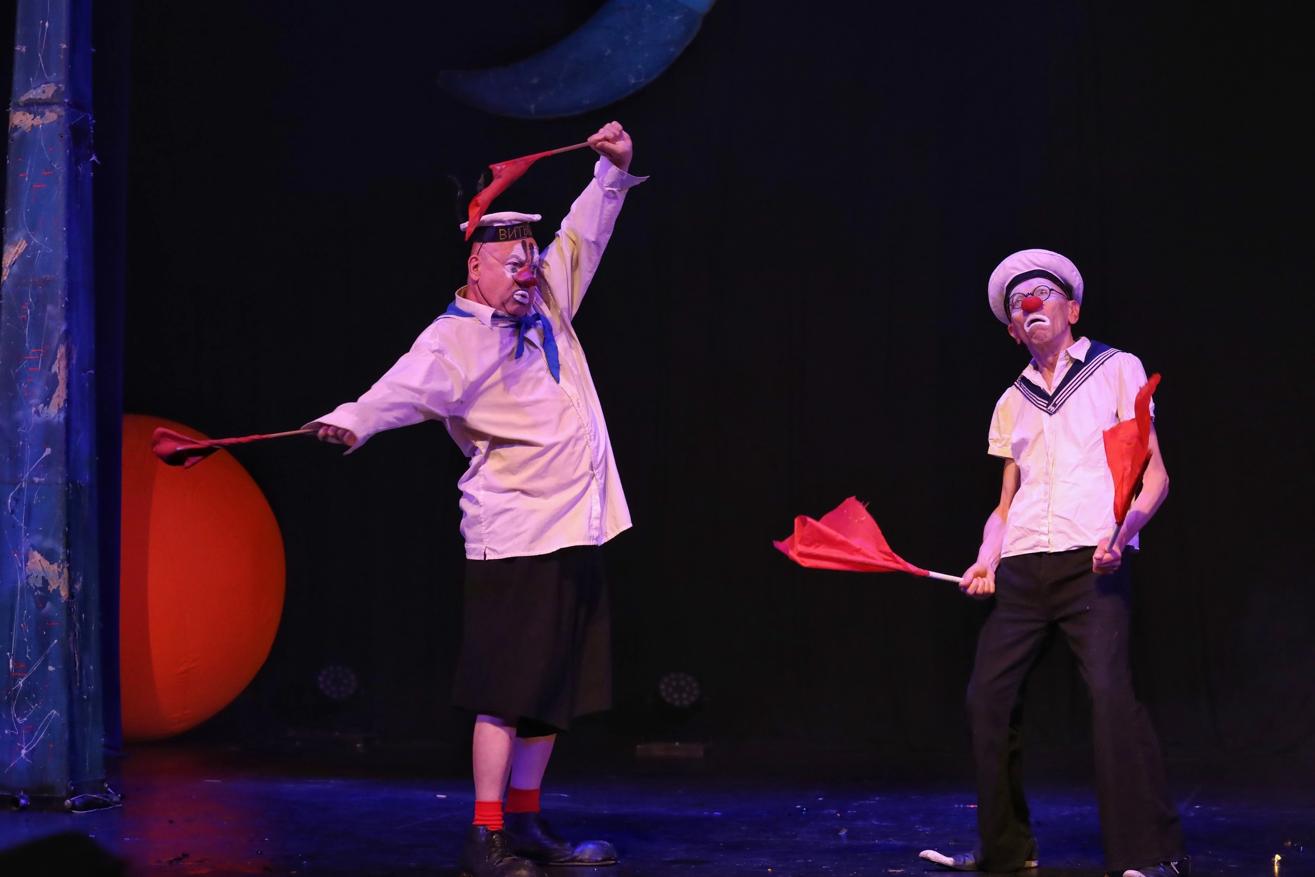 Или яркие – буквально в блестках – выходы Полины Бондарь, старающейся привлечь внимание к каждому своему движению и жесту – и это тоже отражение общества, ведь все мы хотим внимания и восхищения. Или номер с бесконечным вытиранием о разные части тела больших клоунских ботинок, – который раньше персонаж Леонида Лейкина исполнял на пару с Асисяем Вячеслава Полунина, а теперь исполняет вместе с Анваром Либабовым, – как бы долго его не исполняли, он все равно вызывает смех – мол, сейчас мы раз и навсегда выясним, кто из нас тут дурак и об кого можно вытирать ноги. Или на сцену выходит тот же Анвар Либабов и Виктор Соловьёв и под тягучую песню Джеймса Брауна «It’s a Man’s Man’s Man’s World» начинают пить и играть в русскую рулетку, – ну, чем не жизненная картина.