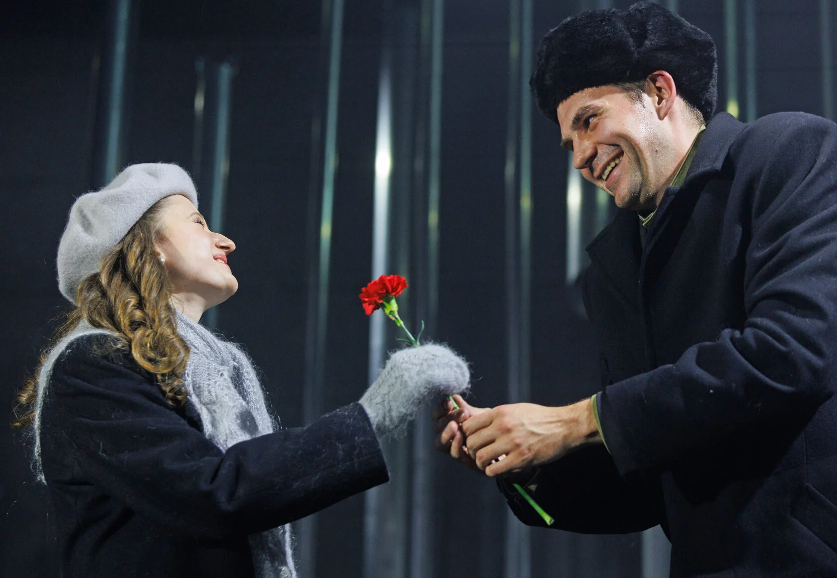 В «Варшавской мелодии» театра «Мастерская» (постановка Александра Гошукова и Григория Козлова по пьесе Леонида Зорина, премьера — апрель 2023) Гелена (Дарья Завьялова) и Виктор (Глеб Савчук), как и мы, встречают Новый год. 1947. Страна восстанавливается после страшной войны, люди учатся жить дальше, влюбляются, ходят на свидания, мечтают, строят планы. На сцене стоят два театральных стула с номерами мест. Потому что знакомятся герои на концерте в консерватории.