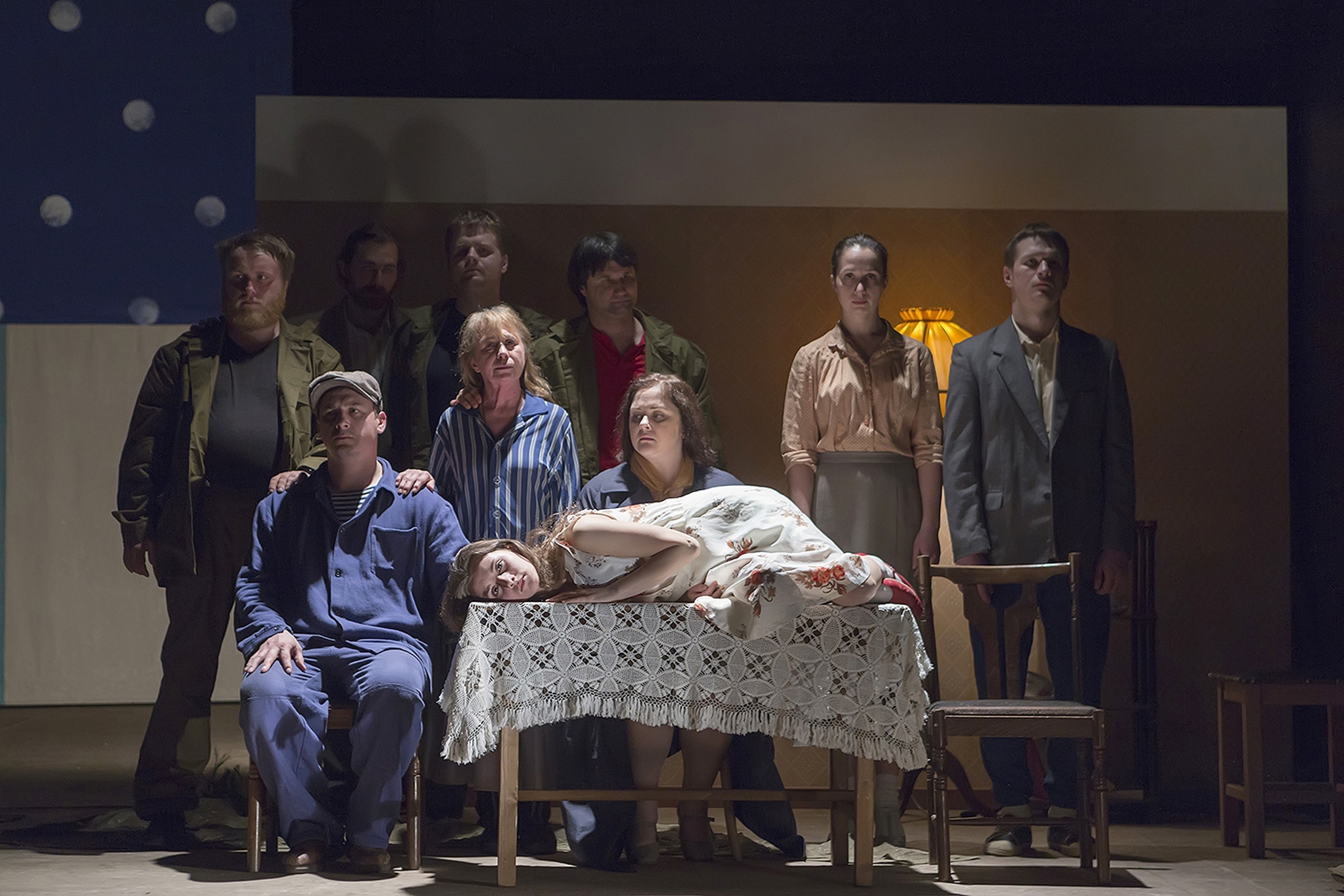 “Лавр” — произведение непростое, оно полно смешения исторических эпох, уровней восприятия действительности. Хитросплетённое и метафизическое повествование аккуратно структурировано режиссёром без нарушения внутренней логики. Смешение эпох показано в тонкостях сценографии, предметы современности и старины перемешены и соседствуют рядом. И порой кажется, что и те, и другие загадочны и потеряли своё изначальное предназначение. Облупленные казённые стены, красные шали, бетонные блоки, береста и дерево помогают действию и актёрам преодолеть сложность сплетения эпох. Разные фактуры подчёркивают то холод и пустоту, то тепло и уют. Но могут использоваться актёрами в парадоксальном контексте, что служит толчком для размышления. Повествование идёт нелинейно, как фотографическое мгновение возникают разные сцены. Актёры связаны этим выстроенным миром, и пытаются в своём многоголосье донести идею автора и многогранность образа главного героя. Но каждому из них будет предоставлен миг откровения, для раскрытия своего персонажа, характера. С этим они справляются прекрасно, не выпадая из общего ритма постановки.