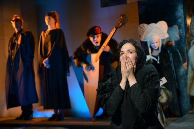 Зальцман переписала Островского, сохранив текст шести ключевых персонажей, и сжала продолжительность до полутора часов. Действие закольцовано и раскручивается от финала. Всё, что происходит на сцене — болезненные фантазии и воспоминания Катерины перед шагом в бездну. Сцена — замкнутое пространство-коробка, в котором задыхается героиня. Вокруг — старые кривые зеркала (художница Лилия Хисматуллина). В них то ли можно увидеть неискаженную реальность посреди морока, то ли это портал в Хаос, откуда появляется лубочный хор скоморохов. Это проводники истории, напевающие как будто бы пересобранные русские народные песни. Жанр “Грозы” — сказочка, рифмуется с композитором Ванечкой (Оркестр приватного танца), традиционно наполняющим ироничными зонгами спектакли Петра Шерешевского, да так, что тексты еще долго звучат в голове, как навязчивые поп-хиты. Ванечка уже сотрудничал с Зальцман на выдающемся спектакле “Розенкранц и Гильденстерн мертвы”, который идет на сцене Театра на Васильевском. Появляется на сцене и языческий медведь-оборотень, который оборачивается то мужем, то любовником. Кабаниха тут — маленькая сухонькая старушка, она разговаривает ласково и немного визгливо. Эта усердная, фальшивая ласка и таящееся внутри зло и нелюбовь к человеку в исполнении Ирины Герасимовой пугают гораздо сильнее привычных однобоких образов хозяйки-тирана с Домостроем под мышкой. Кабаниха порет дочь ремнем и в то же время берет на руки, словно дитя, выслушивая его жалобы, Дикого (Михаил Окунев).