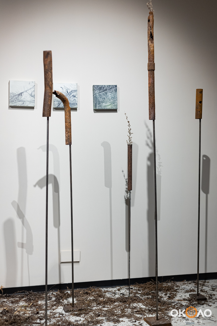 Получилось в некотором смысле site specific высказывание. Например, металлические скульптуры выполнены из металла, найденного в окрестностях Шуваловского парка. Они одновременно отсылают к стойкам в транзитной зоне аэропорта и к органическим формам, то ли камышам, то ли деревьям.