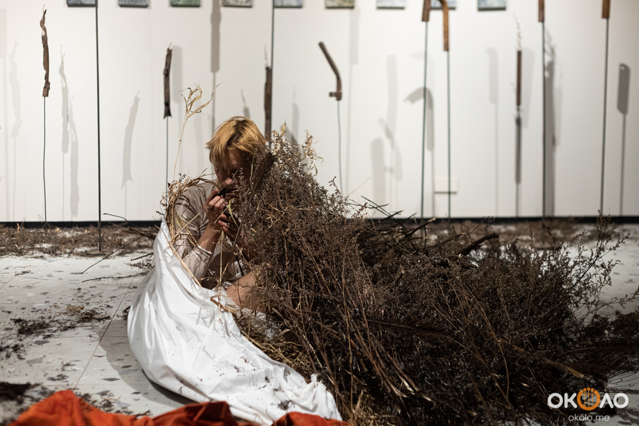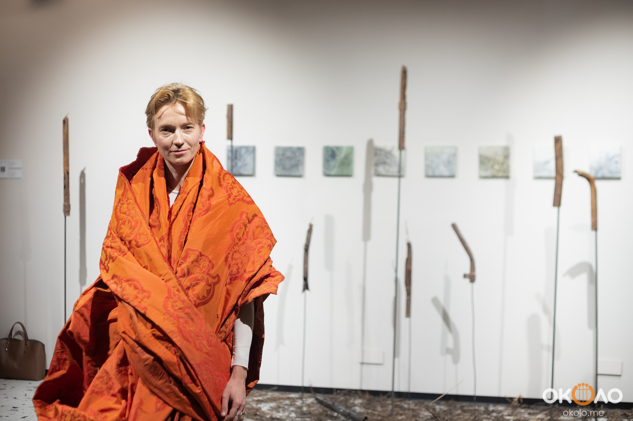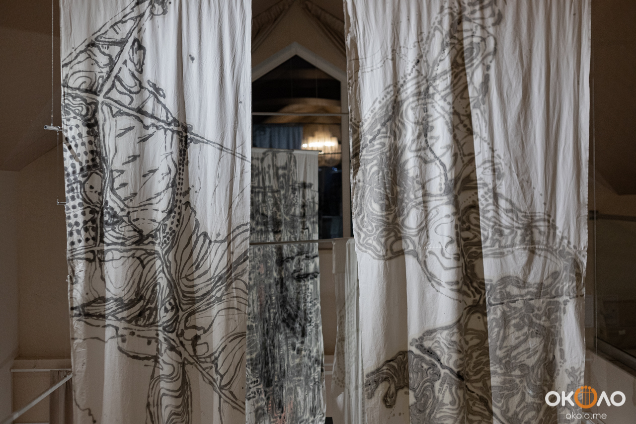 Текстильная инсталляция здесь выступает как полотно жизни, полотно мира в целом, а нити сплетения ткани и картографические изображения рельефа окрестностей выставочного пространства как раз говорят об этом взаимодействии леса и города.