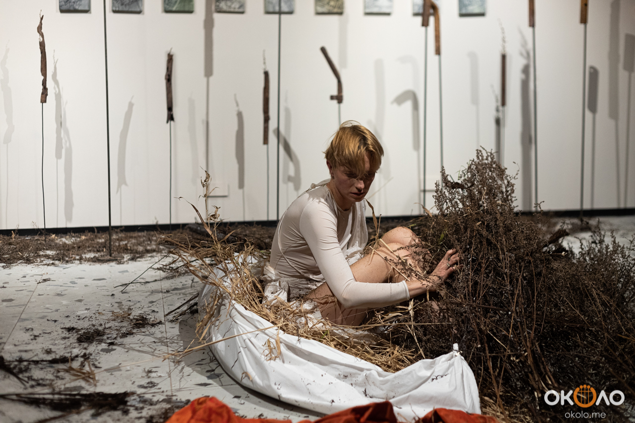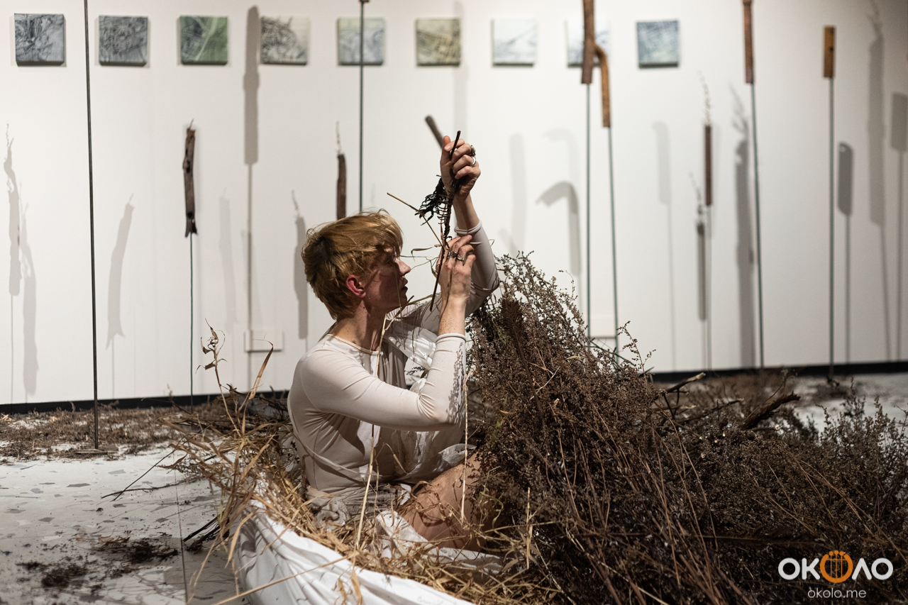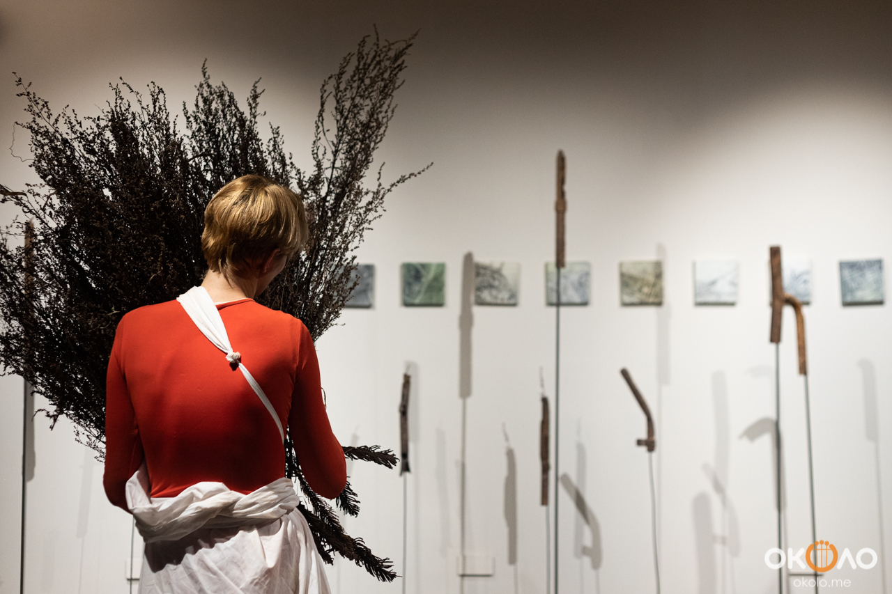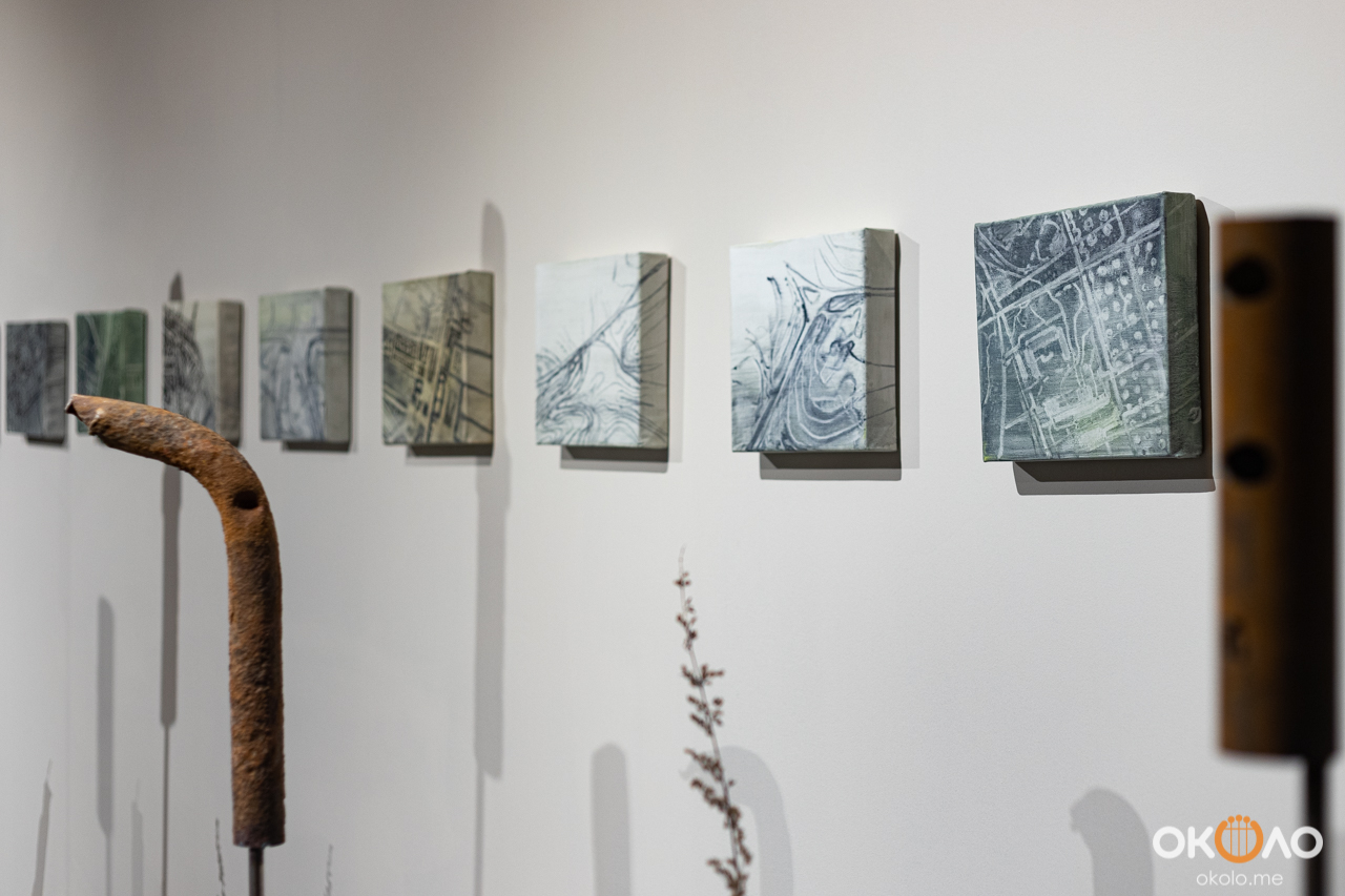 Текстильная инсталляция здесь выступает как полотно жизни, полотно мира в целом, а нити сплетения ткани и картографические изображения рельефа окрестностей выставочного пространства как раз говорят об этом взаимодействии леса и города.