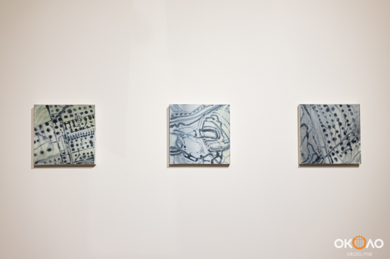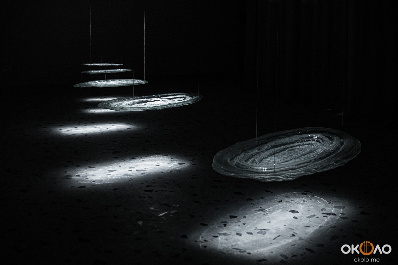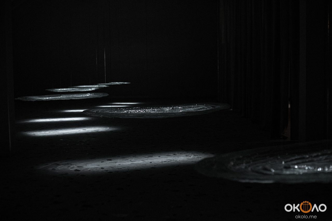 Моя инсталляция состоит из 7 прозрачных стеклянных кругов, изображающих траекторию запущенного камня во время игры в водные «блинчики». Прозрачное стекло вместе с бликами создаёт иллюзию водной глади, заполнившей все вокруг. Инсталляция изображает периферию городской жизни, в которую проникают природные истоки: интерьер помещения превращается в тихий водоем и становится метафорой спокойного состояния ума и души человека.