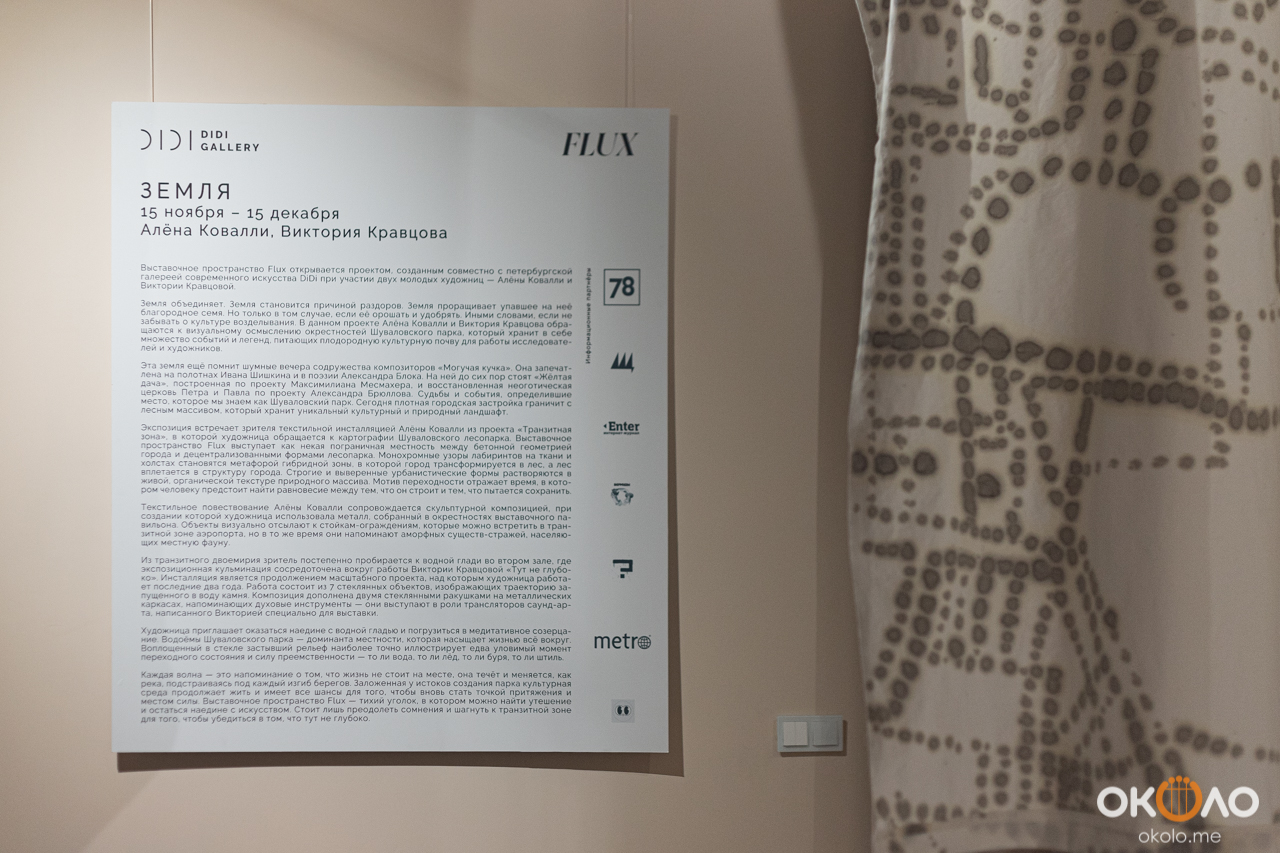 Открытие нового выставочного пространства FlUX состоялось 14 ноября. Расположение на границе городской среды с Шуваловским парком определило спектр интересов FlUX. Первым проектом в коллаборации с DiDi Gallery стала выставка «Земля», объединившая инсталляций двух петербургских художниц. Проекты «Транзитная зона» Алёны Ковалли и «Здесь не глубоко» Виктории Кравцовой были созданы в результате изучения Шуваловского парка специально для выставки. Мы посетили вернисаж и побеседовали с создателями нового пространства о его концепции, а также попросили художниц рассказать о том, что вдохновило их на создание проектов.