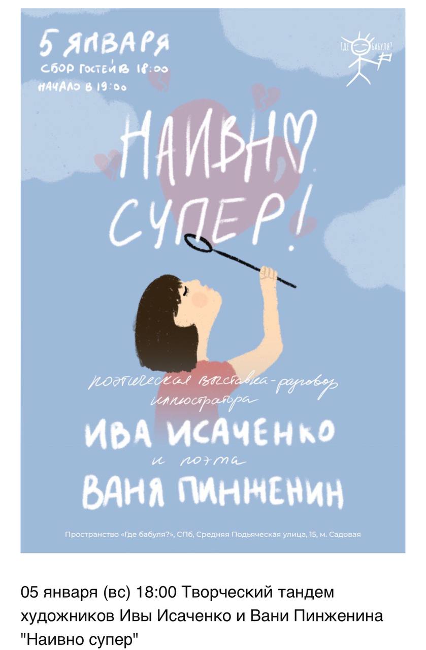 Мы этого не выбирали. Мы художники, мы так видим. И вы смотрите. Человеку нужен человек. За каждой картиной скрывается история, за каждой историей стоит художник, и ему есть что рассказать. Пространство «Где бабуля?» приглашает 5 января в 18.00 на поэтическую выставку-разговор с иллюстратором ваших слов Ивой Исаченко и поэтом Ваней Пинжениным «Наивно.Супер».