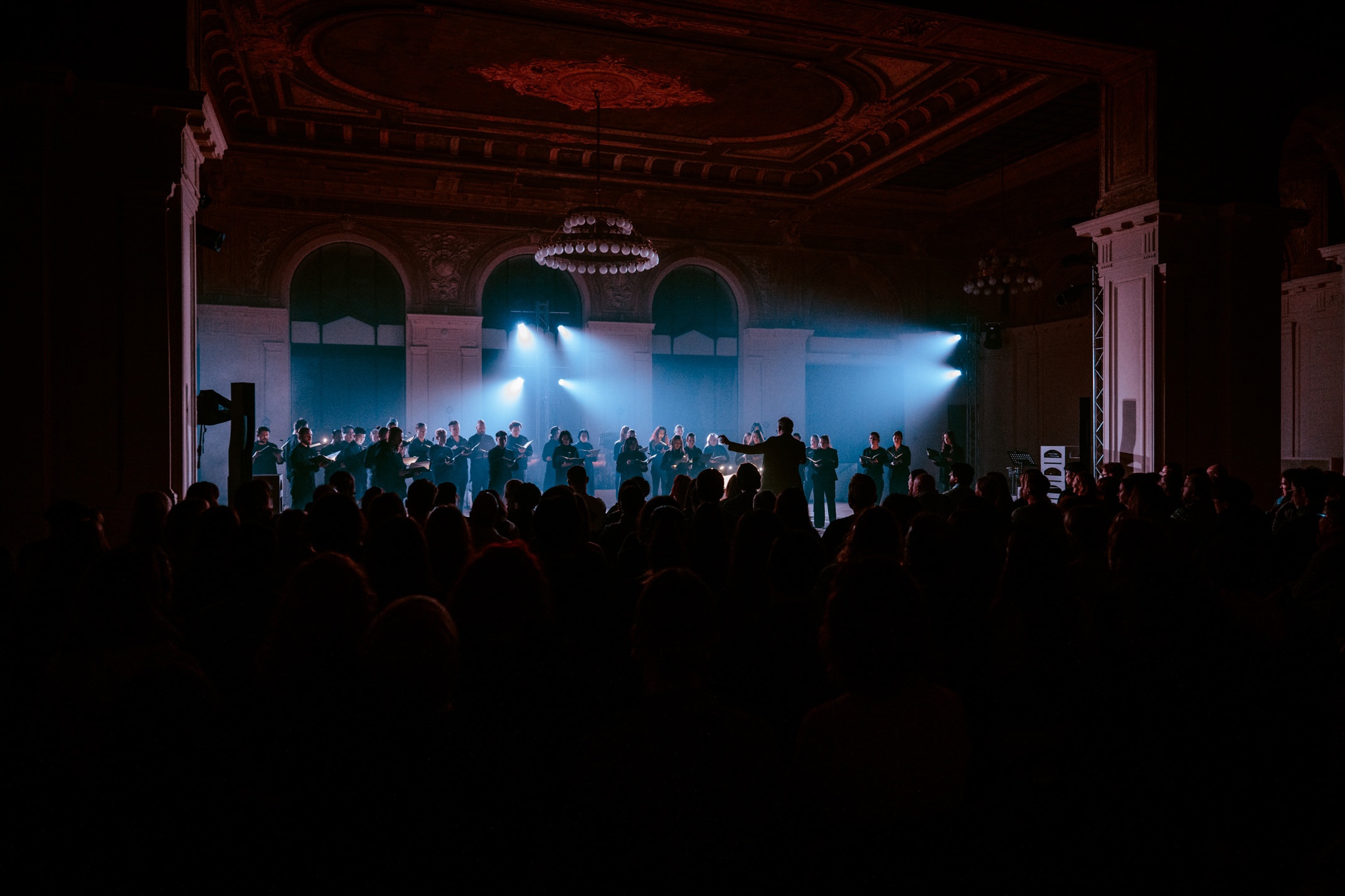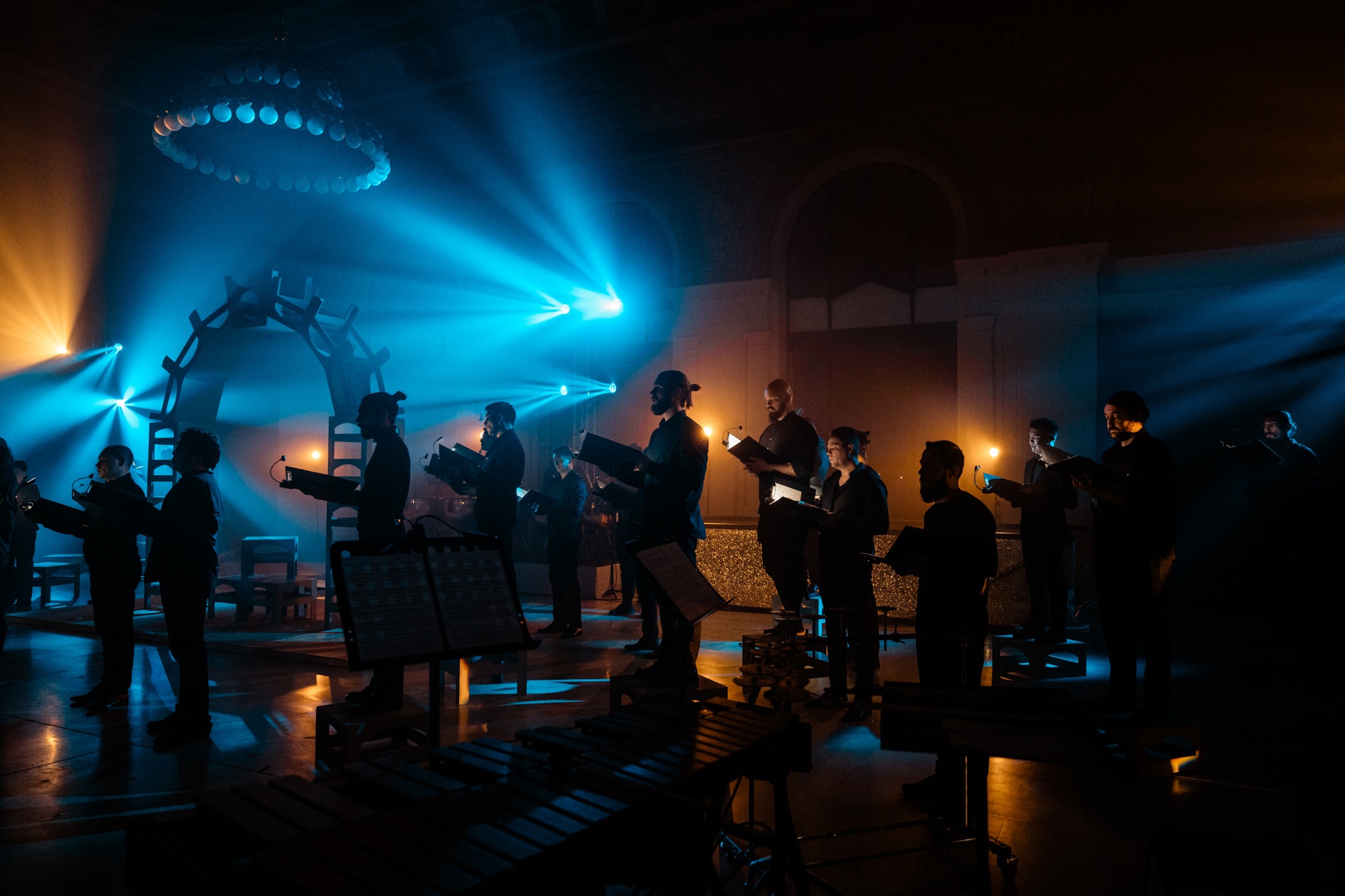 Режиссером вечера выступила Нина Воробьева, запомнившаяся мне удачной «Волшебной флейтой» на Дягилевском фестивале 2024. Грамотного постановщика видно сразу: буквально несколько штрихов, не противоречащих сути события, четкая форма без излишеств. Пространство, успевшее стать привычным за месяц активной работы Дома Радио по новому адресу, преобразилось: зрителей и сцену поменяли местами, мы впервые прошли в самую глубь зала. Формообразующую роль традиционно играл свет, выстроенный Анатолием Ляпиным. Крайне деликатно действовала хореограф проекта Валентина Луценко – в движении артистов хора практически невозможно было усмотреть постановочность или нарочитую мистериальность (как, например, в концерте «Esperia», где подчеркивалась инаковость). Здесь же исполнители выглядели и двигались будто бы «посюсторонне», но транслировали довольно сложный концепт метафизического храма, созидаемого телами всех вовлеченных. Музыкальный руководитель и дирижер постановки – Евгений Воробьев, также герой летней «Волшебной флейты», давно, регулярно и все более органично сотрудничающий с musicAeterna.