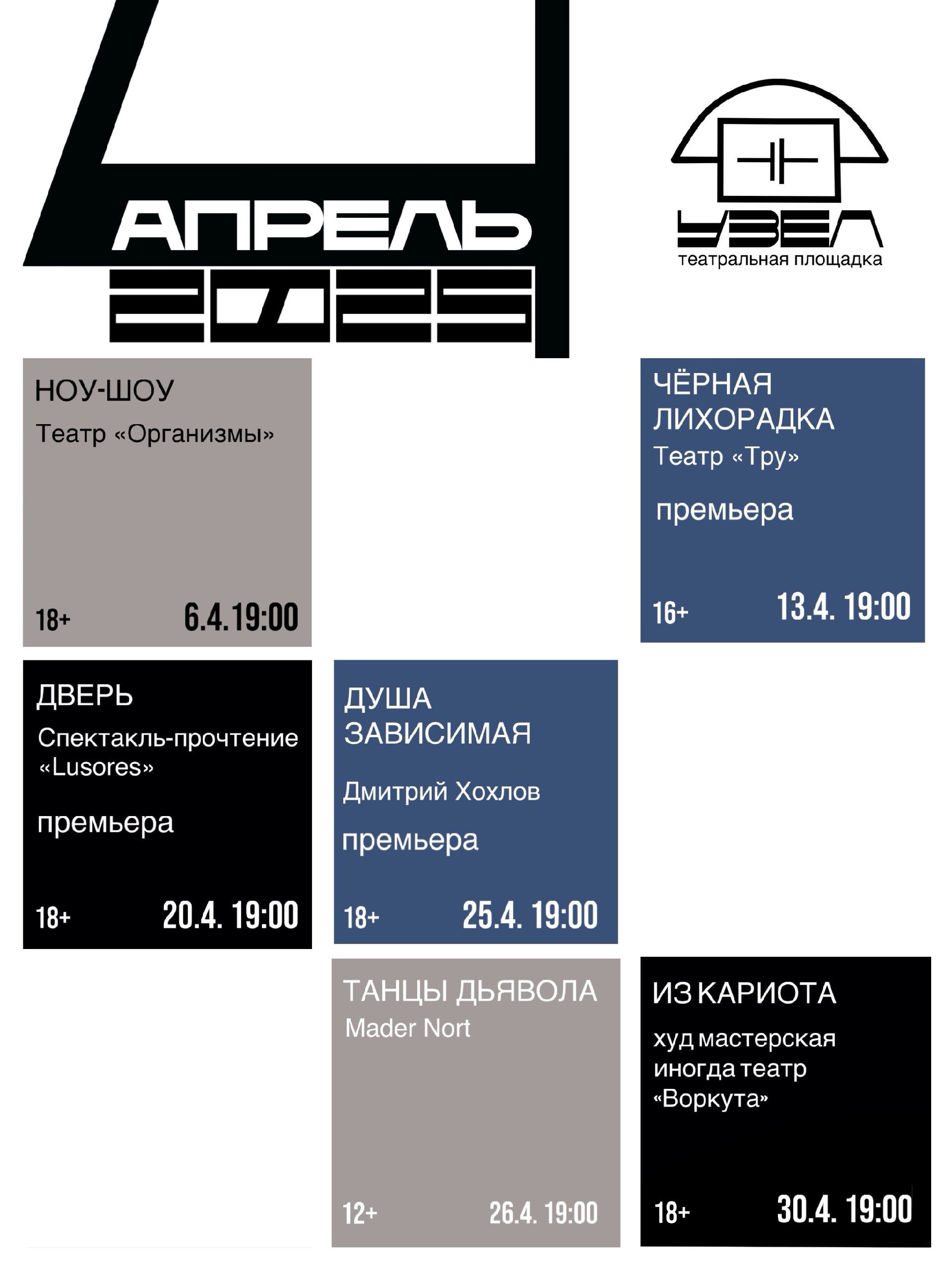 30.4. Из Кариота | худ мастерская иногда театр «Воркута» — спектакль по повести Леонида Андреева, который уделит внимание самой известной и понятной истории и (почти) самому известному и худшему из людей. Программа может дополняться. билеты по ссылке
