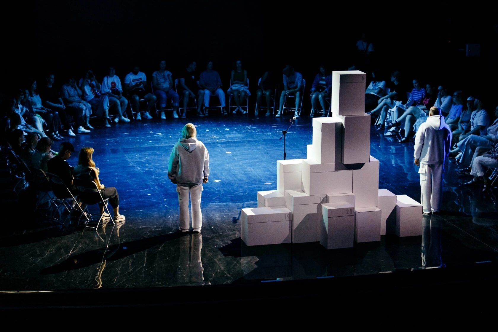 Устроен он так: на сцене 18 белых коробок с подарками от старшего поколения, «бабушек и дедушек», нам — поколению сегодняшнему. В московских показах участвовали актеры в ролях старших, у нас вводную речь произнес сам режиссер. Задача зрителей — распаковывать подарки в строгой очередности, узнавая стоящие за ними истории. Эти истории быстро обманывают ожидания: разнятся по подаче, длительности и степени конкретики, среди бабушек оказывается мусульманская женщина-президент, а среди дедушек — китайский оппозиционер и даже ящер.