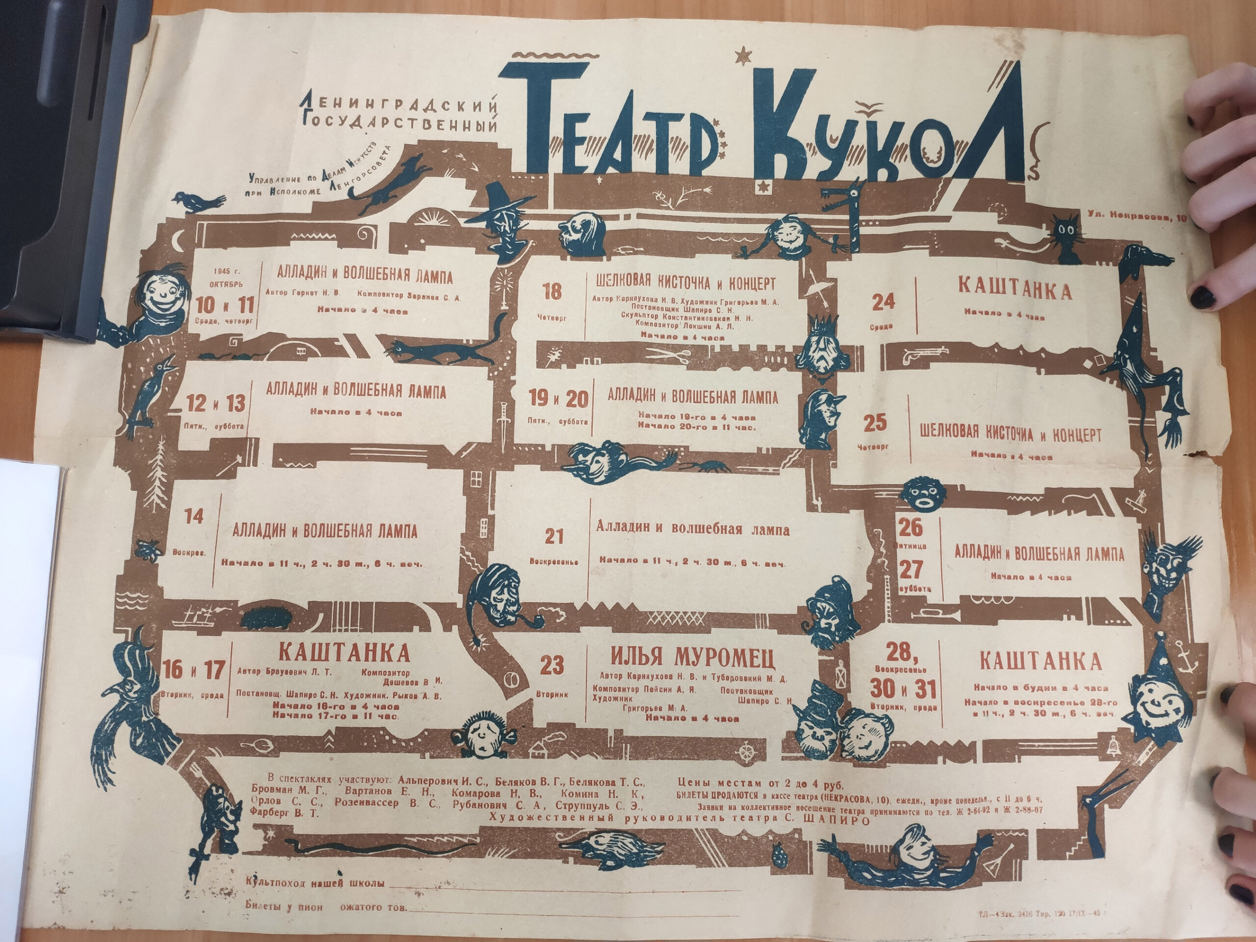 Также в фойе театра зрители смогут увидеть выставку, посвященную спектаклям театра в 40-е годы и военное время. На выставке будут представлены афиши, программки, фотографии, куклы 40-х годов, отзывы школьников о первых послевоенных спектаклях, уникальное письмо-воспоминание о блокадной елке в январе 1942 г., рассказы об актерах-фронтовиках и даже куклы «военных» спектаклей.