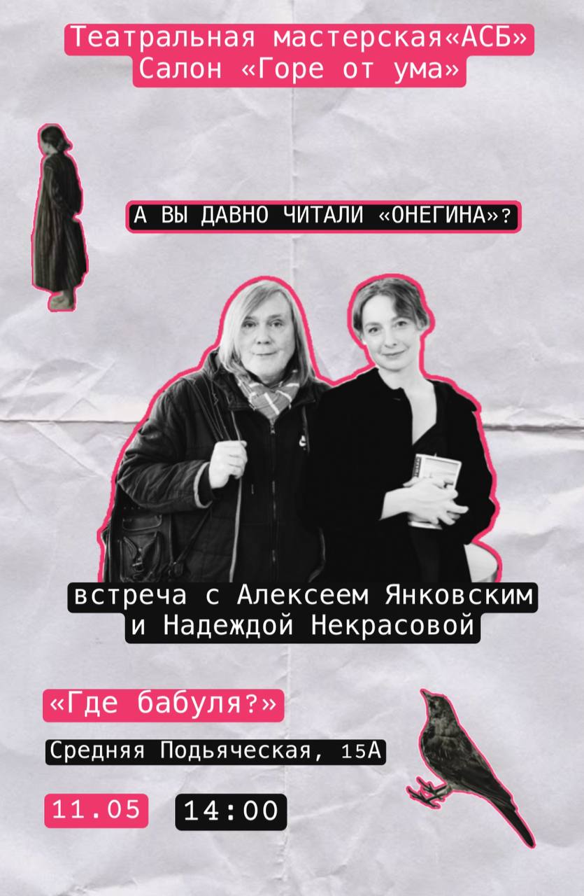 Театральная мастерская АСБ x салон «Горе от ума» представляет творческую встречу «А вы давно читали Онегина?». 11 мая в 14:00 в пространстве «Где бабуля?» встретимся с режиссером Алексеем Янковским и актрисой Надеждой Некрасовой. Поговорим о романе и его актуальных смыслах и послушаем отрывок из спектакля «Евгений Онегин: Евангелие от Татьяны»! Новый опыт от погружения в знакомый текст в преддверие премьерного показа! Когда: 11 мая в 14:00. Где: пространство «Где бабуля?», ул. Средняя Подьяческая, дом 15, литера А.