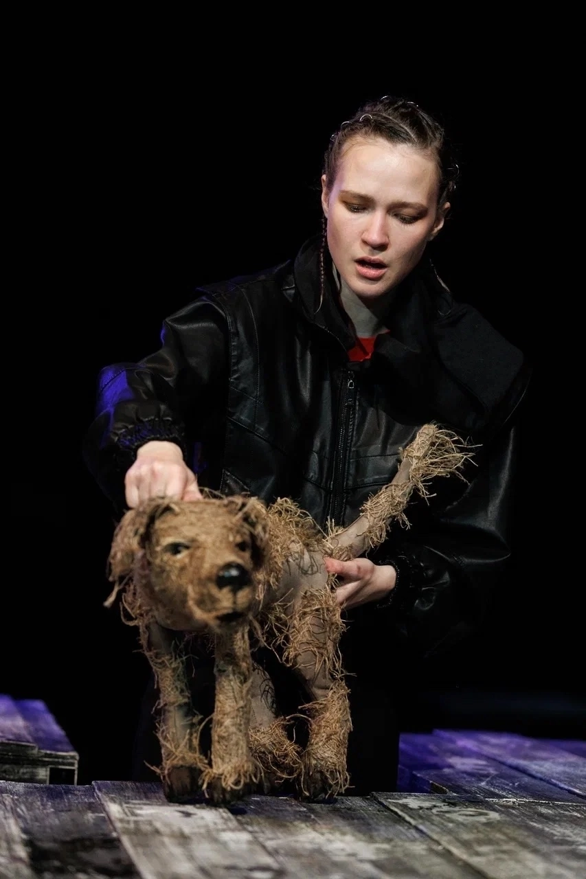 Главный герой в романе – собака Лада, в спектакле это – мягкая игрушечная кукла, которую озвучивает Екатерина Кукуй. В руках артистов кукла начинает крутиться, переворачиваться, оживать. Создается впечатление, что она – настоящая, живая. В славянской мифологии Лада – это божество, покровительница любви и семьи. Она помогала людям пережить суровую зиму и встретить весну. В спектакле собака Лада приносит радость трем не очень счастливым людям. Они как будто просыпаются от долгого сна, совершают добрые дела и заботятся друг о друге. Потом они начинают защищать свой маленький мир и пытаются прогнать или откупиться от ставшего им чужим молодого успешного человека, который непонятно для чего хочет забрать с собой в город собаку Ладу. «Место наше глухое, гиблое. Мы уж тут сами как-нибудь, а ты, милок, поезжай в город. Тебе там лучше будет. Мы тебе и денег на дорогу дадим».