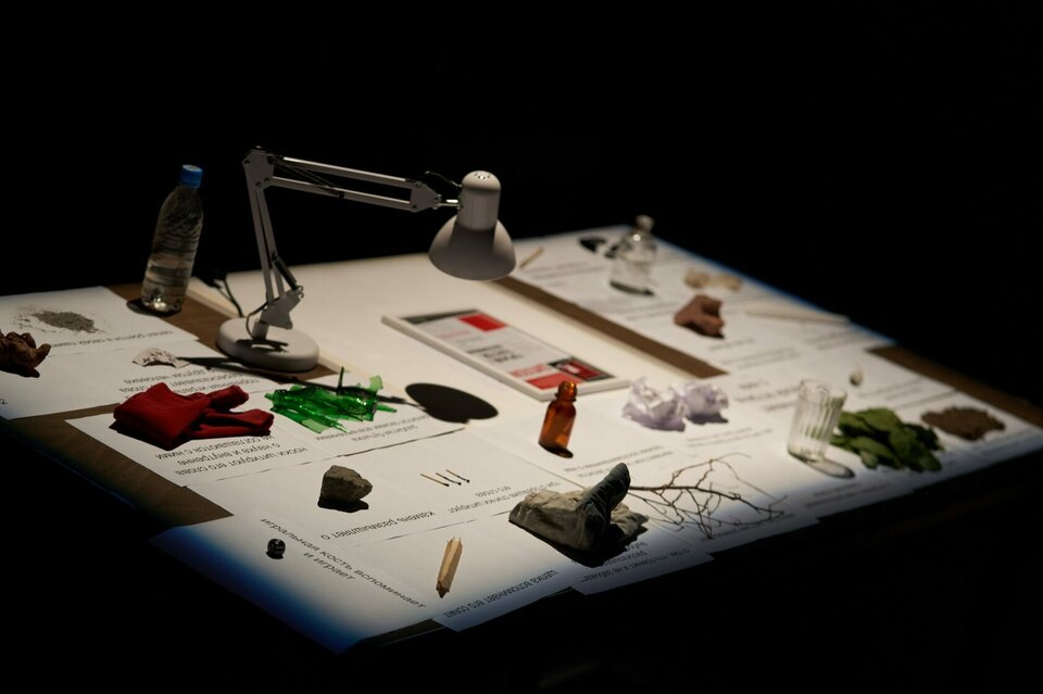 Дмитрий Волкострелов появляется на сцене, надевает белые перчатки, как работник музея или библиотеки, открывает контейнеры для мелочей, достаёт реквизит. Он готов создавать для нас миры, рассказывать нам истории о том, как Лев Толстой относился к женщинам, пьяным, творчеству. Он кладёт на листы белой бумаги следующий экспонат своего музея, и на экране блестит «горлышко разбитой бутылки».