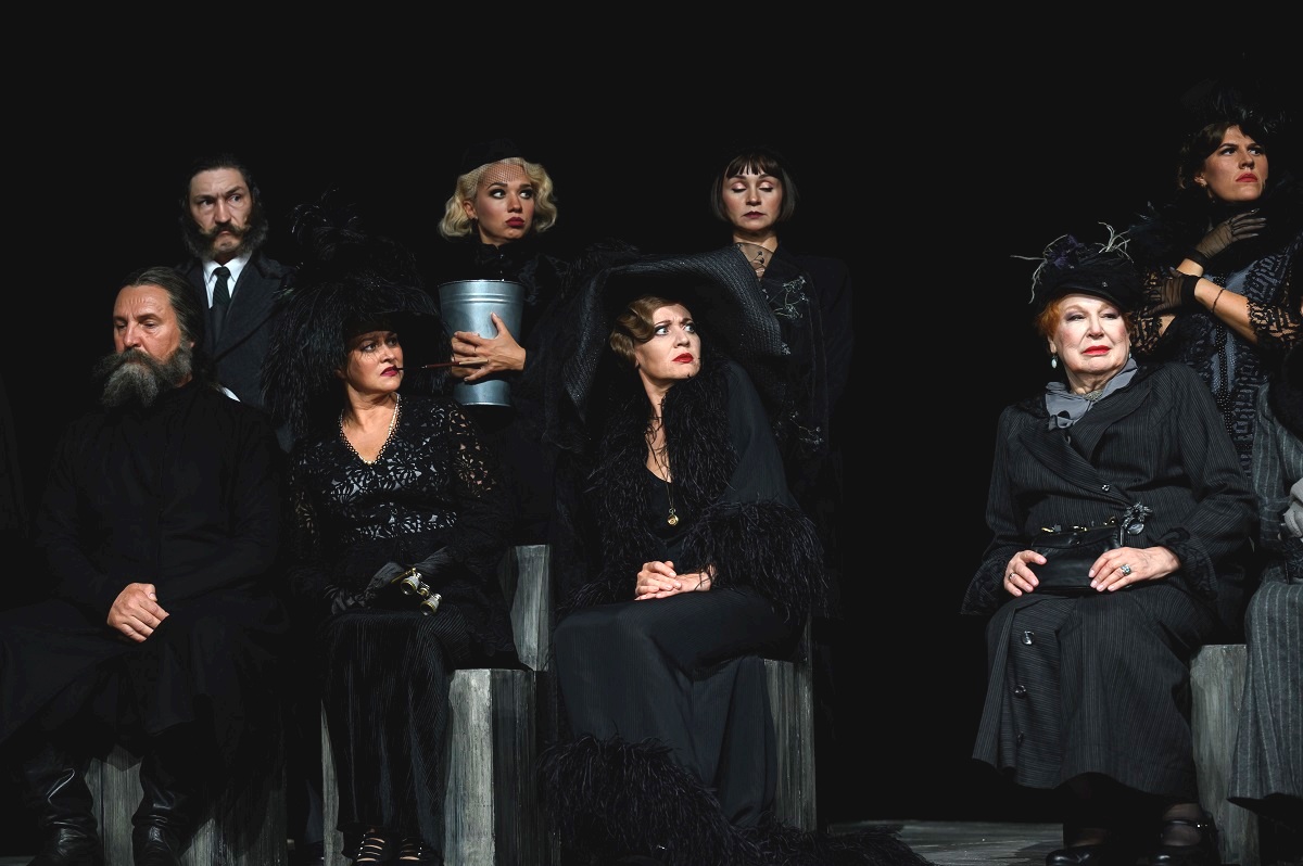 Сценографом выступает сам Рощин и, возможно, ключ в том, что он не «режиссер и заодно художник», а художник – в первую очередь. Режиссер может искать варианты, монтировать без ущерба замыслу, взгляд же художника бескомпромиссен. Вынь мельчайшую деталь и все посыплется. Палитра Рощина легко узнаваема, причем знакомое можно увидеть не самоповтором, а фирменным цветом, хотя это и не всегда комплиментарно для артистов. Например, рисунок роли тещи (Янина Колесниченко) полностью повторяет партии Елены Немзер в александринских «Вороне» и «Отелло». Ускоренная перемотка речи священника и выход за пределы зала, а потом и театра средствами видеотрансляции – приемы из «Сирано». Крематорий оборудован панелью управления, точь-в-точь как в замке Отелло.