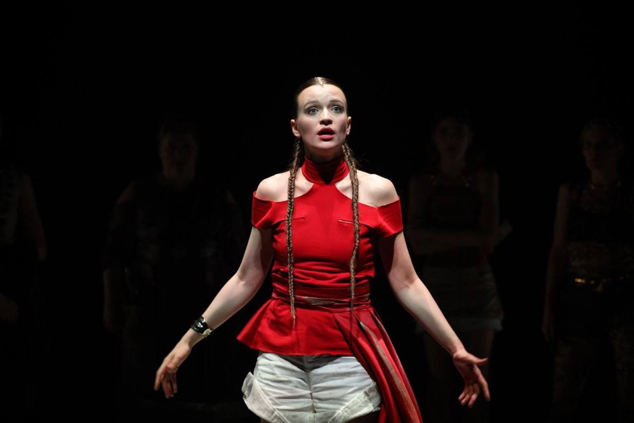 Поэтому так выделяются (в хорошую сторону) сцены, когда они забывают про Аристофана, а начинают играть что-то более человеческое, но их так мало… Чуть ли не главная кульминация, — монолог Лисистраты (Елизавета Потапова), обращенный к отцу «Папа, где ты? Мне не у кого спросить, как надо!» (хотя идея посадить на соседний стул ребенка, в такой же одежде, как будто Лисистрату-девочку — на гране вкуса, на мой взгляд). Такая же человеческая сцена — когда эти женщины, волевые в своей борьбе с милитаризмом мужчин, вдруг оказываются слабыми: под песню Бутусова «Я хочу быть с тобой» они наконец-то занимаются не борьбой (той же войной — не зря с оружием не только мужчины, но и «пацифистские» женщины), а повседневными делами (кто альбом листает, кто огурцы прямо из банки ест). Скучают они по своим мужчинам, по нормальной жизни. Хотя и эта эмоция тоже подвергается иронии всеобщим танцем под «Позвони мне, позвони». Но все эти приличные сцены тонут в капустной театральщине…