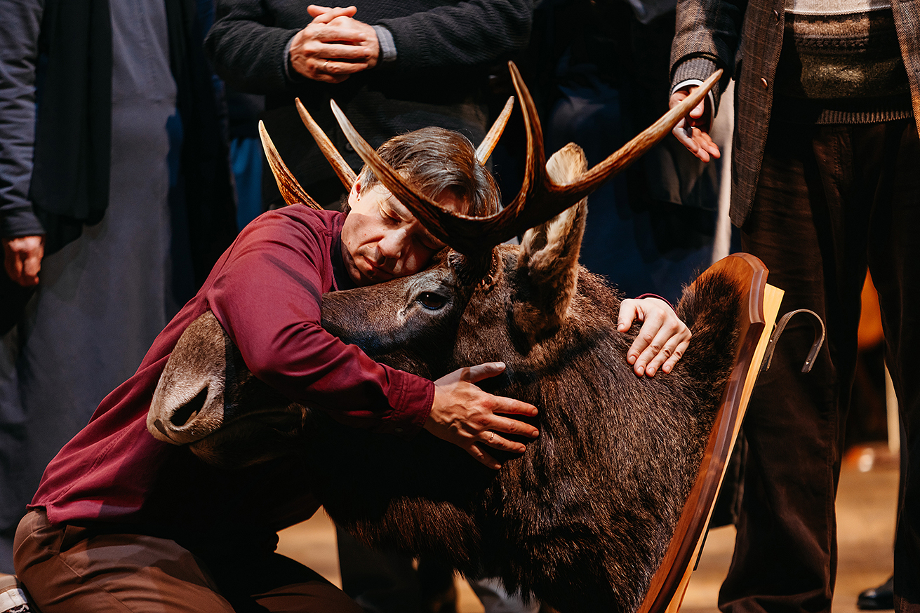 Нам обещали спектакль на два часа, по факту мы вышли из театра около половины десятого. В этой постановке прекрасна массовка из бабушек и дедушек, которые и танцевали, и хлопали, и комментировали в нужные моменты, и осуждали, и сочувствовали, и наблюдали за несчастливой жизнью. Сам же Зилов (Григорий Чабан) — невыросший мужчина-мальчик, думающий про каждую юбку «Может, я ее всю жизнь любить буду. Кто знает». На новоселье друзья дарят этому неверному мужу не охотничьи снасти, а голову рогатого оленя. Зилов трогательно обнимает этого мёртвого зверя, и он будто заменяет траурный венок, который по пьесе ему присылают товарищи с посылом: «Виктор, ты мёртв внутри».
