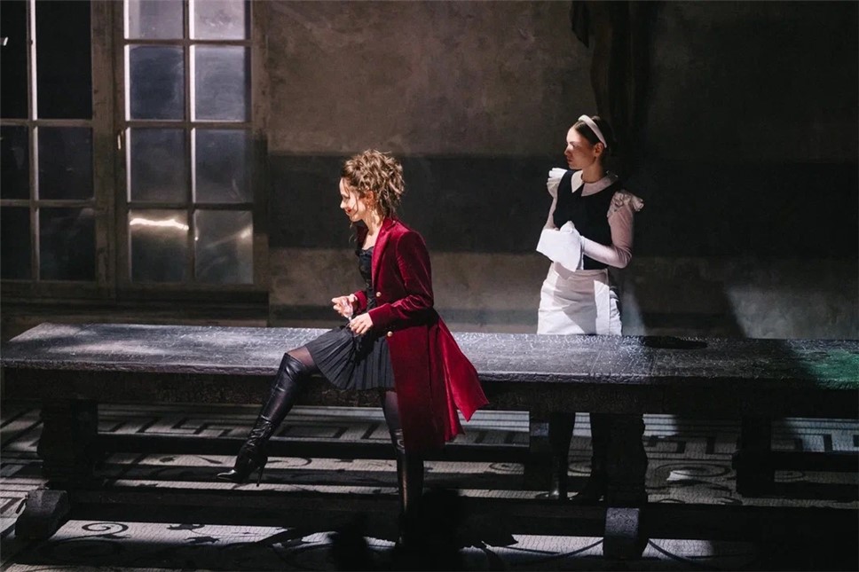 Главную роль сыграла Ольга Лерман. Так непривычно видеть ее в таком амплуа — обычно изящная, летящая, здесь она играет очень истеричную женщину, которая то хочет повелевать всеми, то хочет найти любимого человека, который будет повелевать ею. С первой же сцены она — властная госпожа, играющая своими подчиненными. Она как будто получает удовольствие, унижая их, требуя чего-то абсолютно нелепого. С разницей в минуту она приказывает поцеловать ей руку, а потом почти сразу истерично орет «не сметь». То она ходит по столу, даже буквально над всеми возвышаясь, то говорит «здесь нет чинов». И вполне возможно, она искренне в это верит, она очень хочет наравне общаться с Жаном (Александр Новин), она хочет быть любимой, но хозяйка побеждает внутри нее — вместо нормального диалога она начинает опять приказывать. Мы наблюдаем бесконечные эмоциональные качели — от гнева в нежность, от властной самодурки к всепонимающей женщине.