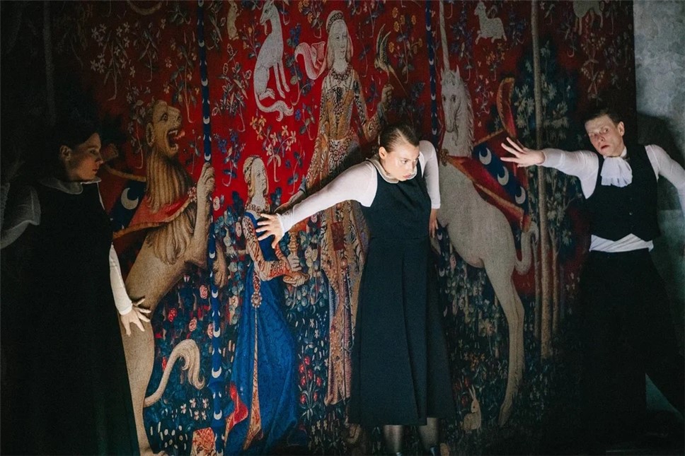 В пьесе всего три персонажа, а Джеймс Нобо вводит еще несколько лакеев и горничных — у них роли без слов, исключительно пластические (хореограф Лулу Млангени). Между сценами они ритмично выполняют обязанности обслуживающего персонала: в ритме танца начищают сапоги, вытирают пыль, расставляют посуду. А во время действия молча (но выразительно) наблюдают за происходящим — как за телешоу… Джеймс Нобо сказал, что они — как греческий хор. Их функцию описать не так просто, но их пластические отбивки, безусловно, задают напряжение и накал.