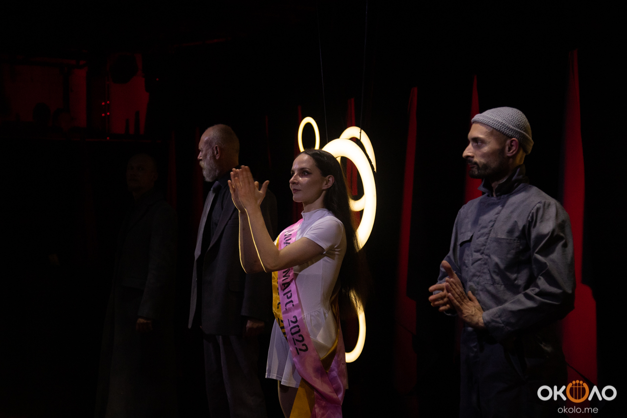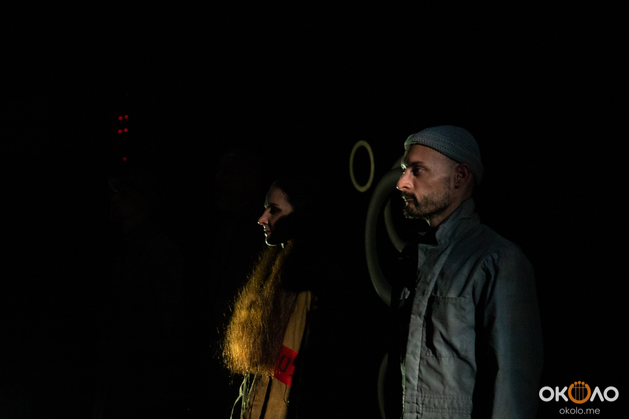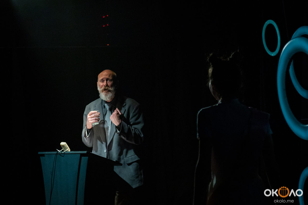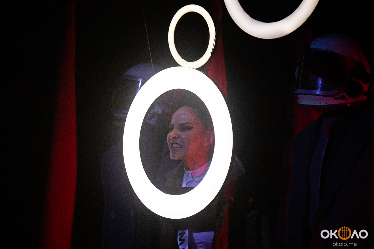Если к переработанным текстам Брэдбери и их подаче вопросов нет, то некоторые режиссерские решения и приемы их все же вызывают. Когда зрители занимают свои места, на сцене уже сидит завернутая в несколько слоев одежды фигура, затем она встает, начинает раздеваться, и под одеждами оказывается Мисс Марс. Сюрприз, безусловно, приятный, но что он должен символизировать, если должен, конечно — загадка. Та же Мисс Марс подносит каждому спикеру стакан воды на подносе, обязательно пронося каждый стакан сквозь один из круглых осветительных приборов. С подносов очень красиво сыпется красный марсианский песок — отличная находка, играющая на атмосферу, но к чему этот пронос стаканов через светящиеся круги, опять же, загадка. Время от времени очень камерное пространство заполняли довольно плотным дымом, что кажется излишним и немилосердным ни по отношению к артистам, ни по отношению к зрителям.