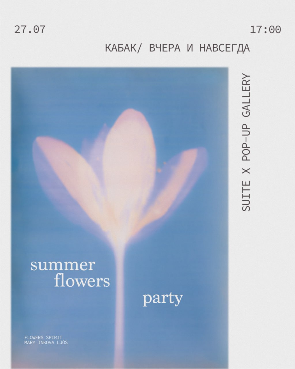 Летняя вечеринка Summer Flowers Party от Pop-Up Gallery состоится в кабаке «Вчера и навсегда» 27 июля. Вечеринка приурочена к камерной выставке художницы Марии Инькóвой Ljós — серии работ «Сияющие цветы». Выставка проходит в рамках коллаборации студии SUITE и галереи современного искусства Pop-Up Gallery.