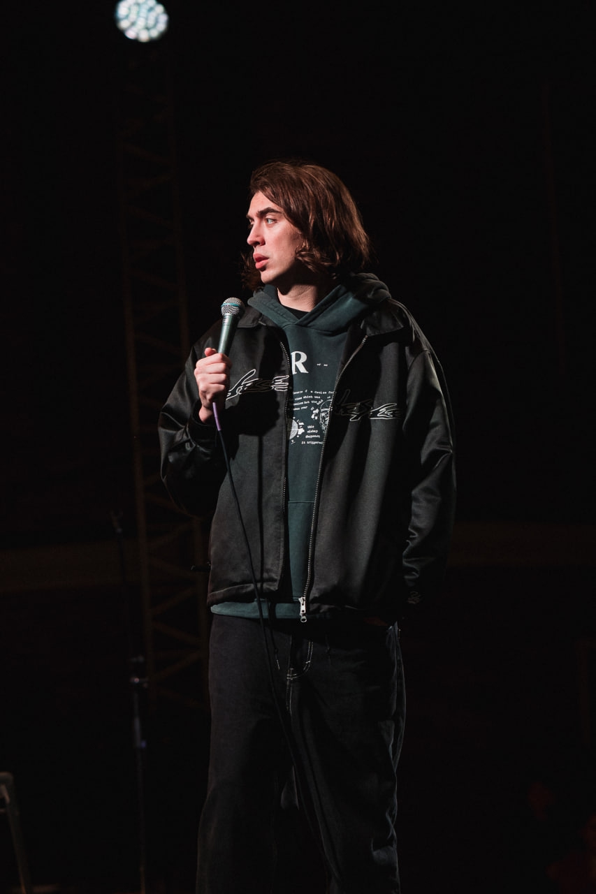 Кульминацией предполагается появление профессионального стендапера, для каждого показа приглашают разных комиков, на сцену «Летнего театра» вышел Дмитрий Коваль. Многие в зале его знали и были рады. Я увидела впервые и была поражена заезженностью тем: жизнь после 30, посещение проктолога, курение, спортзал, порно. Странно, что Михаил Кострецов, ведущий действительно забавных рилс-репортажей А39 «Жизнь богемы», заменявший Льва Зулькарнаева в «Дирижерах», не участвует в «Приоткрытом микрофоне».
