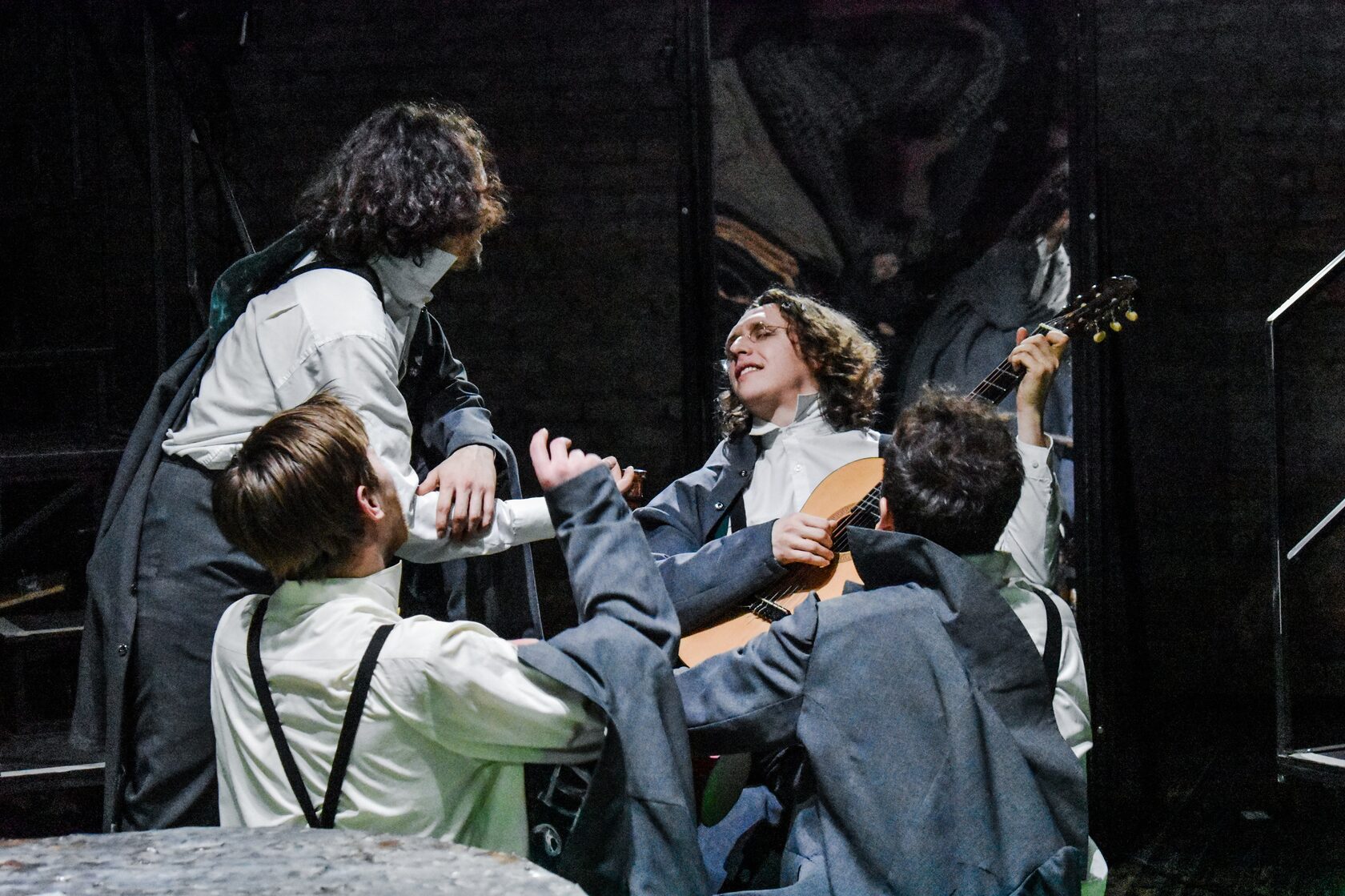 Это нескучная классика с песнями и застольями. Это спектакль, где нет положительных персонажей и никого не жалко. На каждую мелкую рыбку найдётся хищная рыба покрупнее, которая её сожрёт. Один картёжник пытается облапошить другого, а потом оказывается, что всё это был спектакль, а он сам — лишь пешка. Не могу сказать, что спектакль от начала до конца был полётный. Временами он проседал, вероятно из-за того, что играют его очень редко. Но постановка приобретала нужный брутальный градус, когда Сашу принимали в гусары, прочили ему блестящее будущее, надеясь, что он проиграет имение и будущее своей семьи в карты.