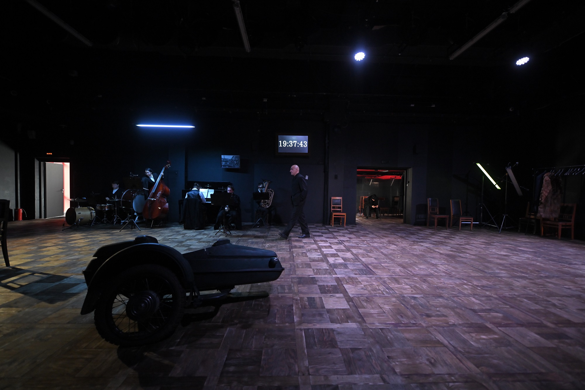 Сцена преобразована в квартиру-страну с несколькими комнатами: две по бокам и центральная сцена, которая, по сути, тоже огромная комната. В этой квартире нет окон, пол устлан паркетом, по краям стоят единичные предметы эпохи 30-х годов, а по центру ведут отсчёт времени большие электронные часы. На переднем плане — мотоциклетная коляска со спущенным колесом. Предметный мир очень важен в спектакле, он чётко выстроен: это не столько вещи того времени, сколько символы и метафоры. Как и мир звуков, усиливающий чувства, а музыка имитирует атмосферу эпохи.